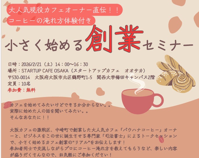 先着10名!!大人気現役カフェオーナー直伝!!コーヒーの淹れ方体験付き 小さく始める創業セミナー(大阪府商工会連合会×スタートアップカフェ大阪)を開催!