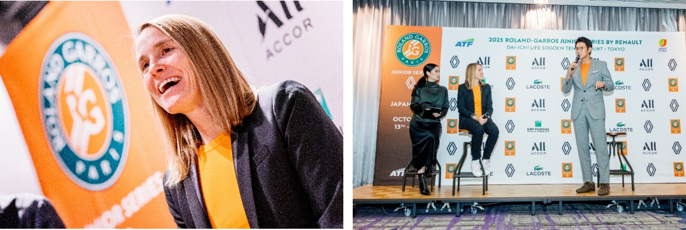 両氏は、ジュニア世代が世界を視野に挑戦する意義について語り合い、エナン氏は「ローランギャロスの大会を初めて観戦したのは10歳の時。シュテフィ・グラフ選手のプレーに感動し、いつか自分もこのコートに立ちたいと強く思い、そこからテニスをより本気になりました」と自身の原点を語りました。