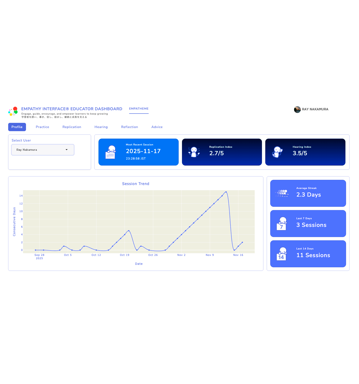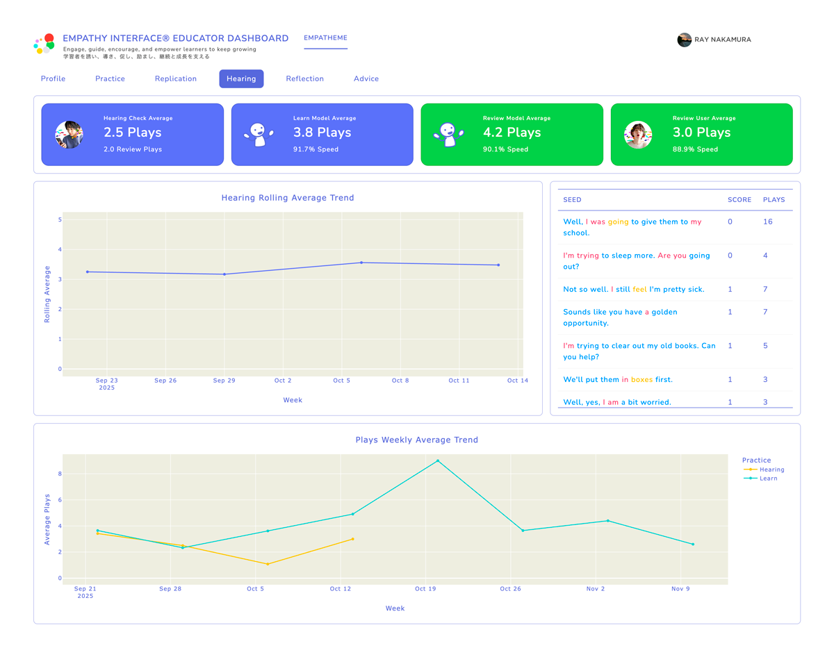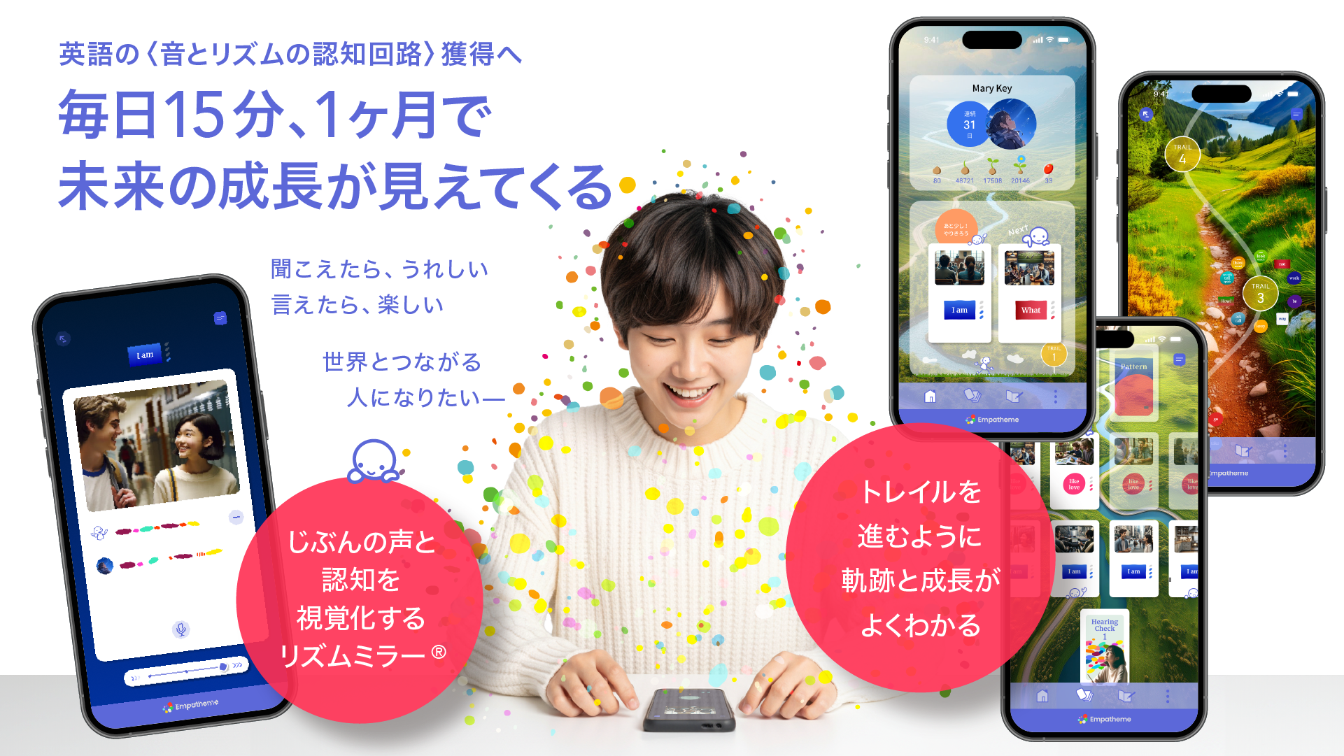 エンパシーム「共創AI 英語耳°サイエンスラボ」は、英語を教える教室ではなく、認知・音声・言語の科学を、毎日のプラクティスとつなぎ、気づきが生まれやすくなるよう誘う伴走の場です。生徒たちは、15分の日課を毎日家で半年以上続けています。再現度に応じて〈シード〉が育つ楽しさ。気づけば上達していた—という驚きや喜び。じぶんの成長のプロセスが〈見える化〉されることで、その手応えが日々のプラクティスと結びつき、上達は加速します。その軌跡は、リズムミラーで視覚化された発話と日々のプラクティスの歩みを記録した「ナオくんの100日の上達軌跡」(動画)でご覧いただけます。