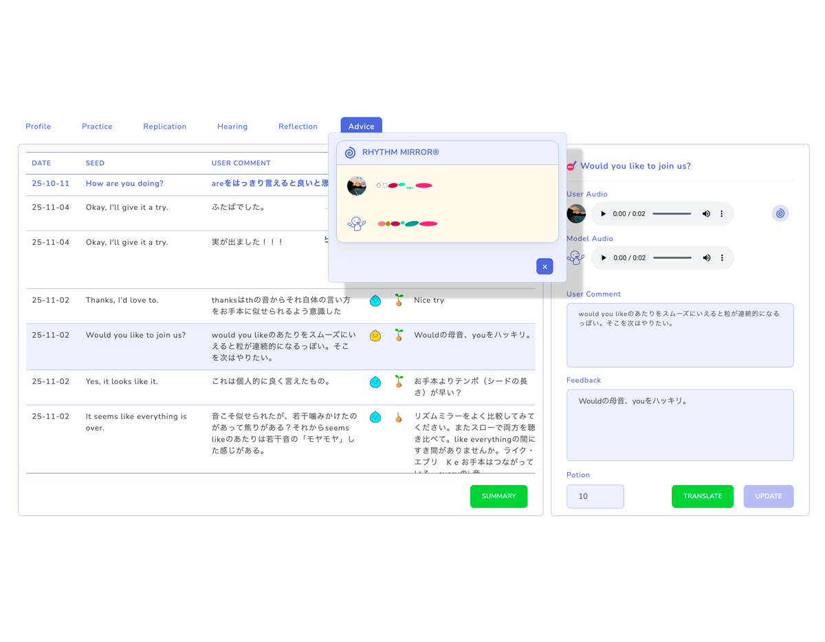 学習者のジャーナルに連動した誘い、導き、促し、励まし、支えを実現。リズムミラー表示、音声再生、アドバイス、メッセージ、フィードバックなどを統合。