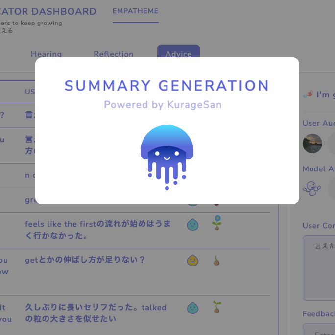 搭載Empathetic AI「KurageSan」によるプラクティス内容の要点サマリー。