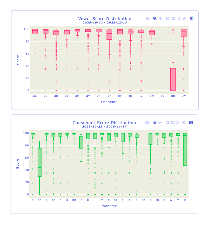 音・リズム・区切れ・抑揚・発音の再現度のサマリーから詳細分析まで把握。学習者自身の自己観察や内省トレンドとあわせて、認知変化の理解をサポート。