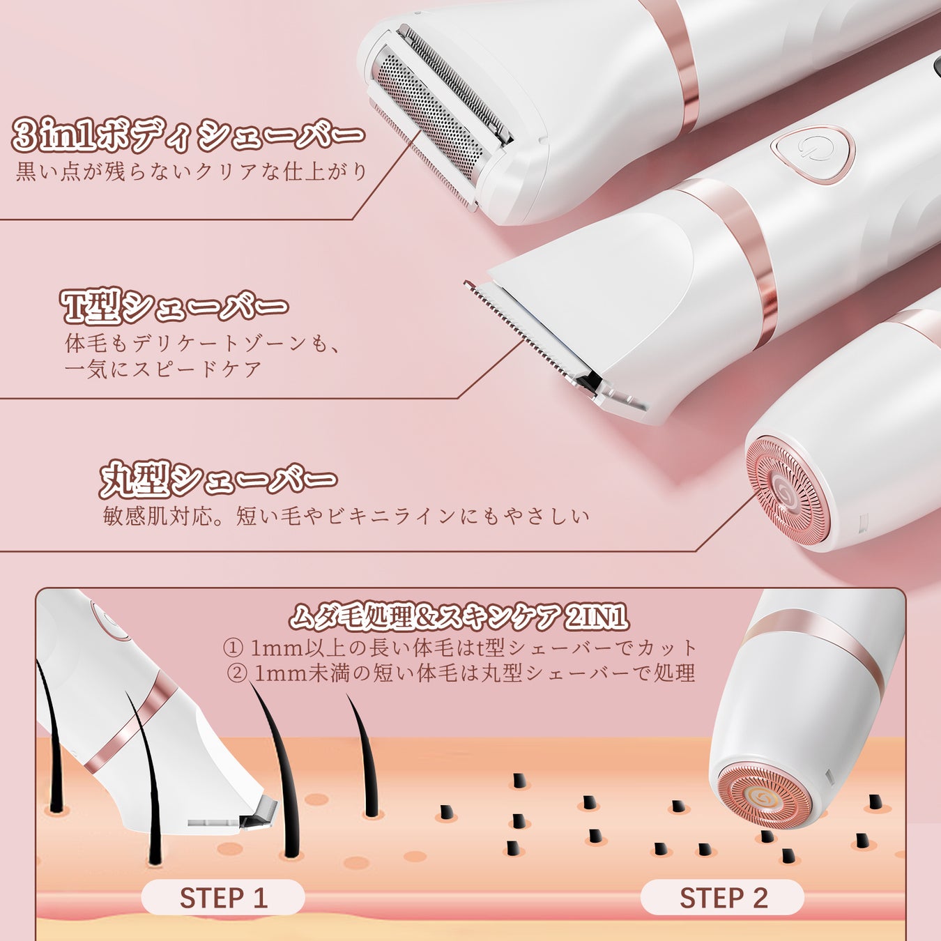 ・T字・I字・往復式の3種ヘッドでフェイス・ボディ・VIO対応。