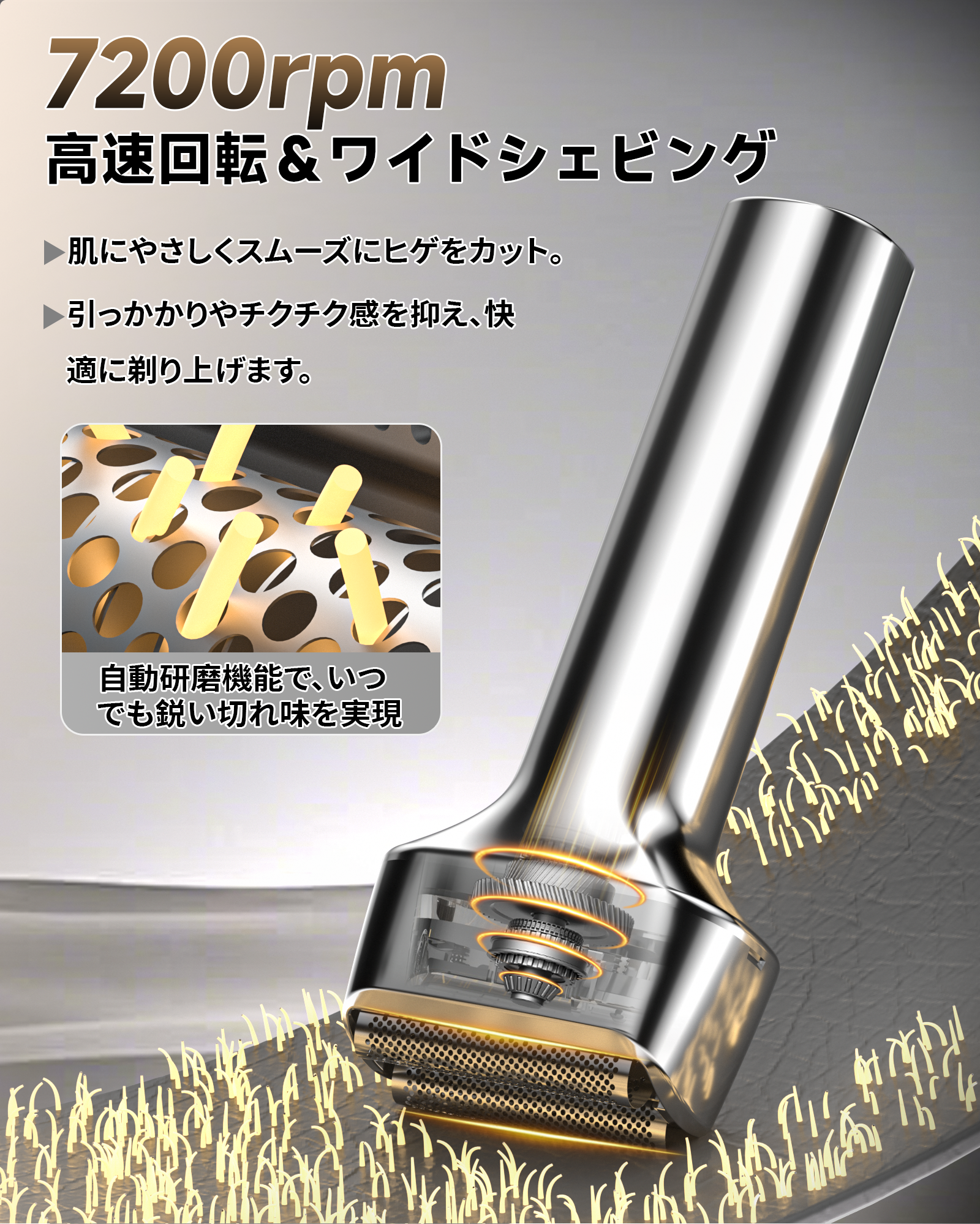 ・R型鈍角刃+高速モーターで肌に優しくしっかり剃れる。