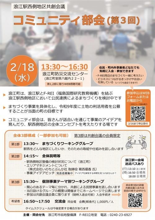 浪江町では、福島国際研究教育機構(F-REI)施設(https://www.f-rei.go.jp/)と浪江駅の間の区域の公民連携まちづくりを推進するため、令和 7 年5月に「浪江駅西側地区共創会議」を発足しました。本会議では、まちづくり事業を具体化し、浪江駅西側地区の敷地 利活用、建物建設および整備、施設運営を行う民間事業者公募の令和9年度実施を当面の目標としています。 共創会議のコミュニティ部会では、当該地区における民間事業の実現性を高める活動を今後2 年間にわたり行うこととし ており、このたび、第 3 回を 2 月 18 日に開催しますので、ぜひ、ご取材賜りますようお願い申し上げます。