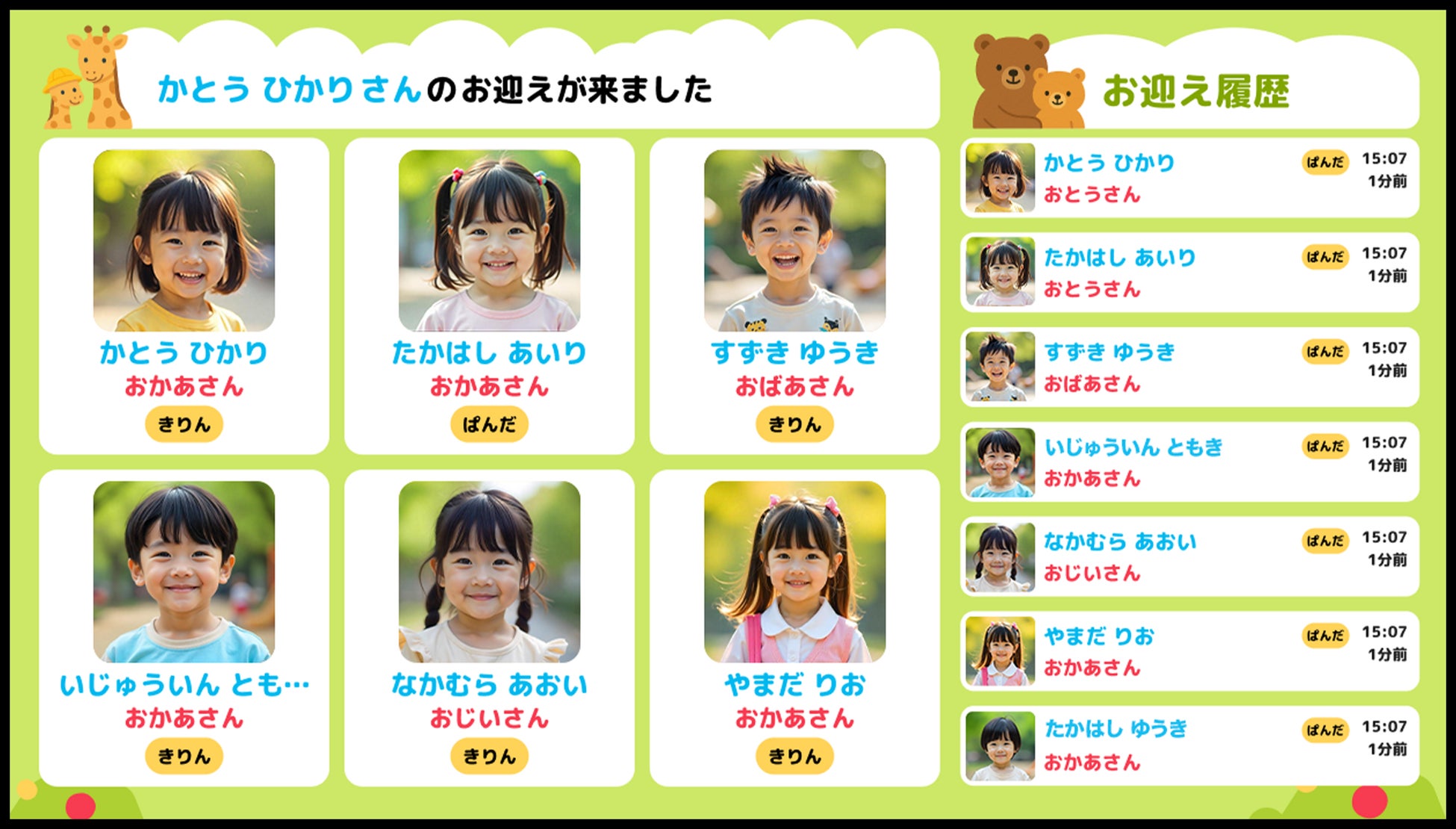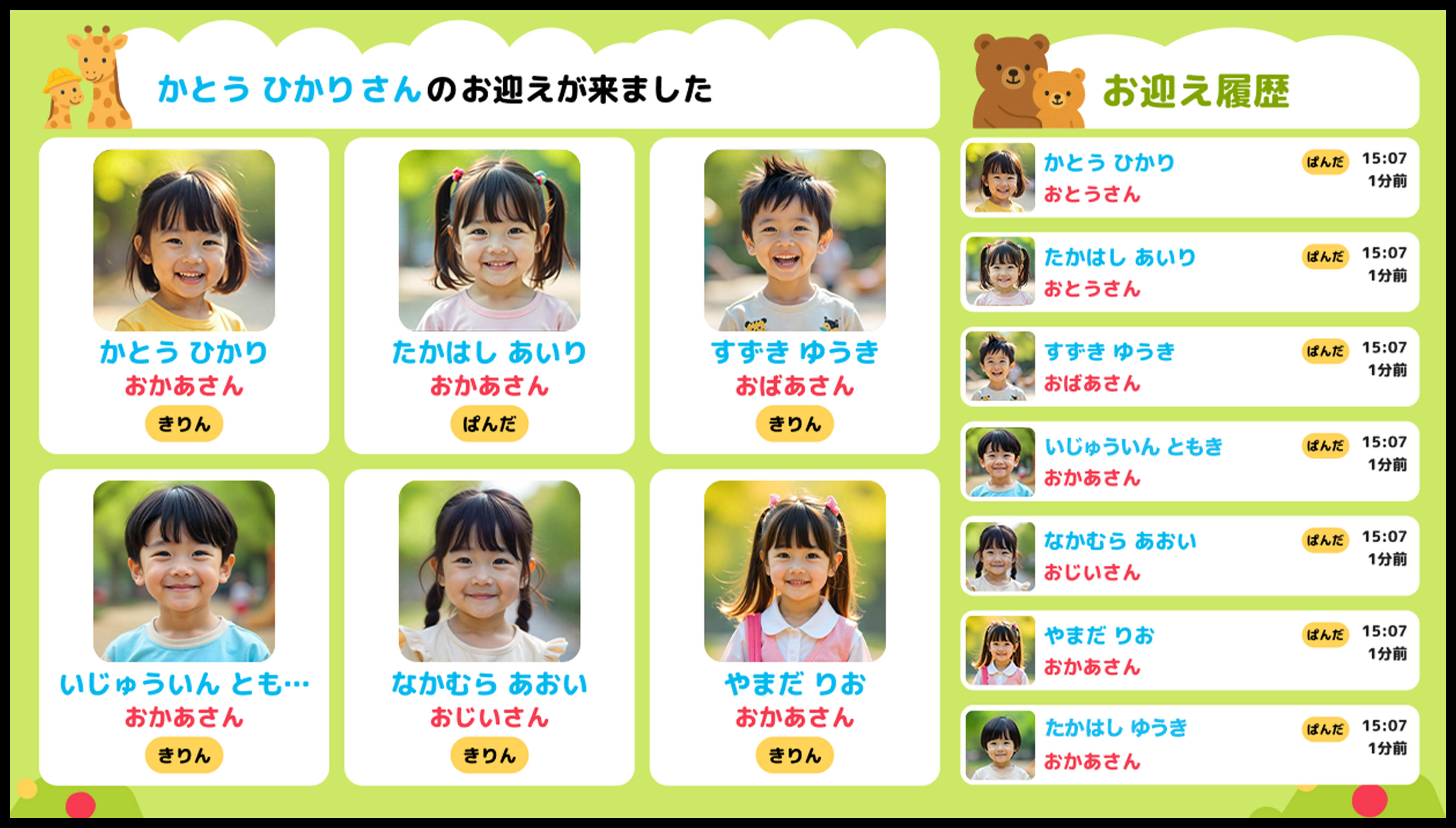 KIDSCALL(キッズコール)は、保護者の顔認証と同時に、お迎えの到着を園内へリアルタイム通知し、入退室記録まで自動化するクラウドサービスです。