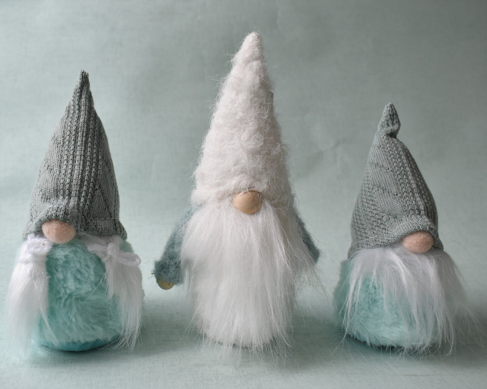 左:ファブリックトムテ GR おさげ 16×7.5×7.5㎝ 825円 右:ファブリックトムテ GR ひげ 16×7×8㎝ 825円 中央:ファブリックサンタスタンドWH 17×10×7㎝ 1,045円