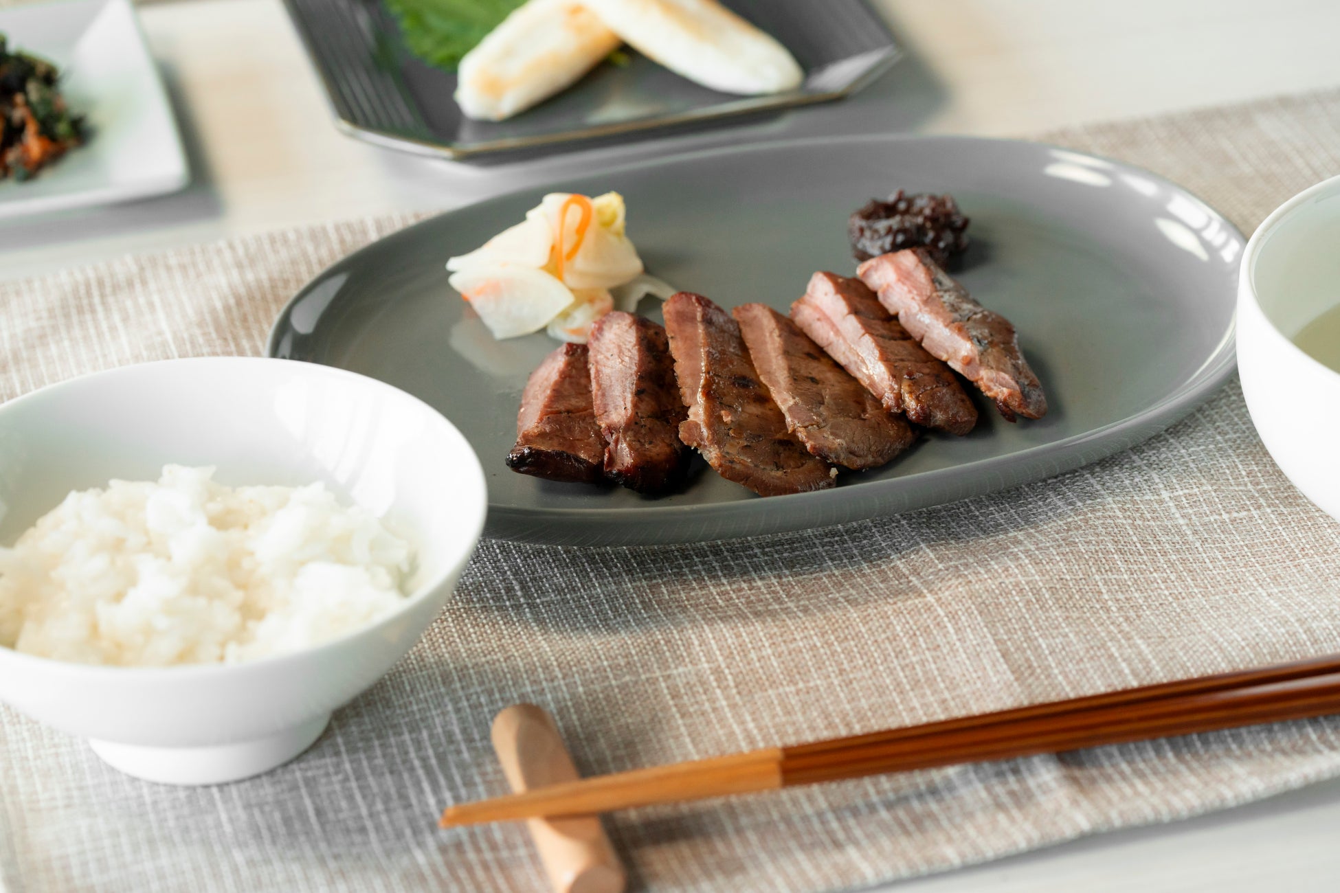 塩麹熟成と低温熟成を⾏う独自の熟成技術により、厚切りでもしっとりとやわらかく、 ⽜タン本来の⾵味を最⼤限に引き出します。