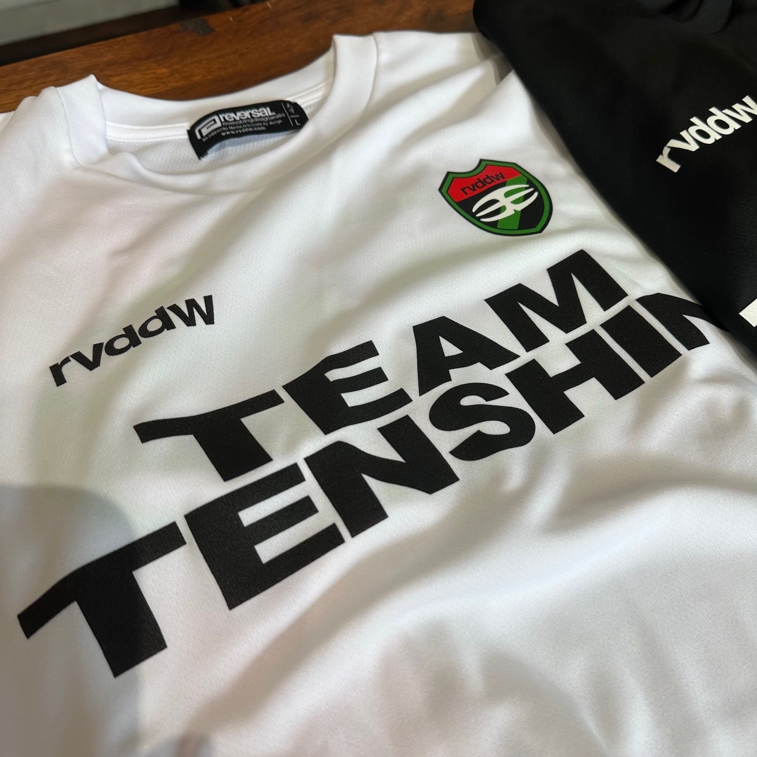那須川選手とrvddwの長年のパートナーシップをチームウェアーに変換すべく、今回のためにrvddwのメインロゴを「TEAM TENSHIN」バージョンにした一枚。天心選手がファンをすぐに認識できるように大き目のプリントを配置。