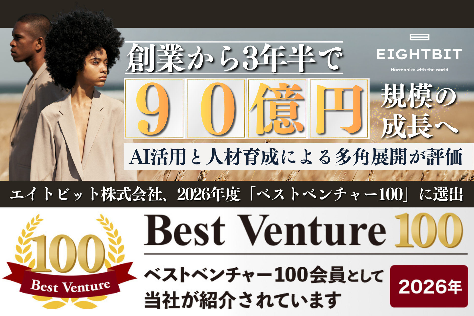 2026年1月エイトビット株式会社(本社:東京都豊島区、グループ代表:茂手木雅樹、以下「当社」)は、イシン株式会社が運営する成長ベンチャー企業の表彰制度「ベストベンチャー100」の2026年度版に選出されたことをお知らせいたします。