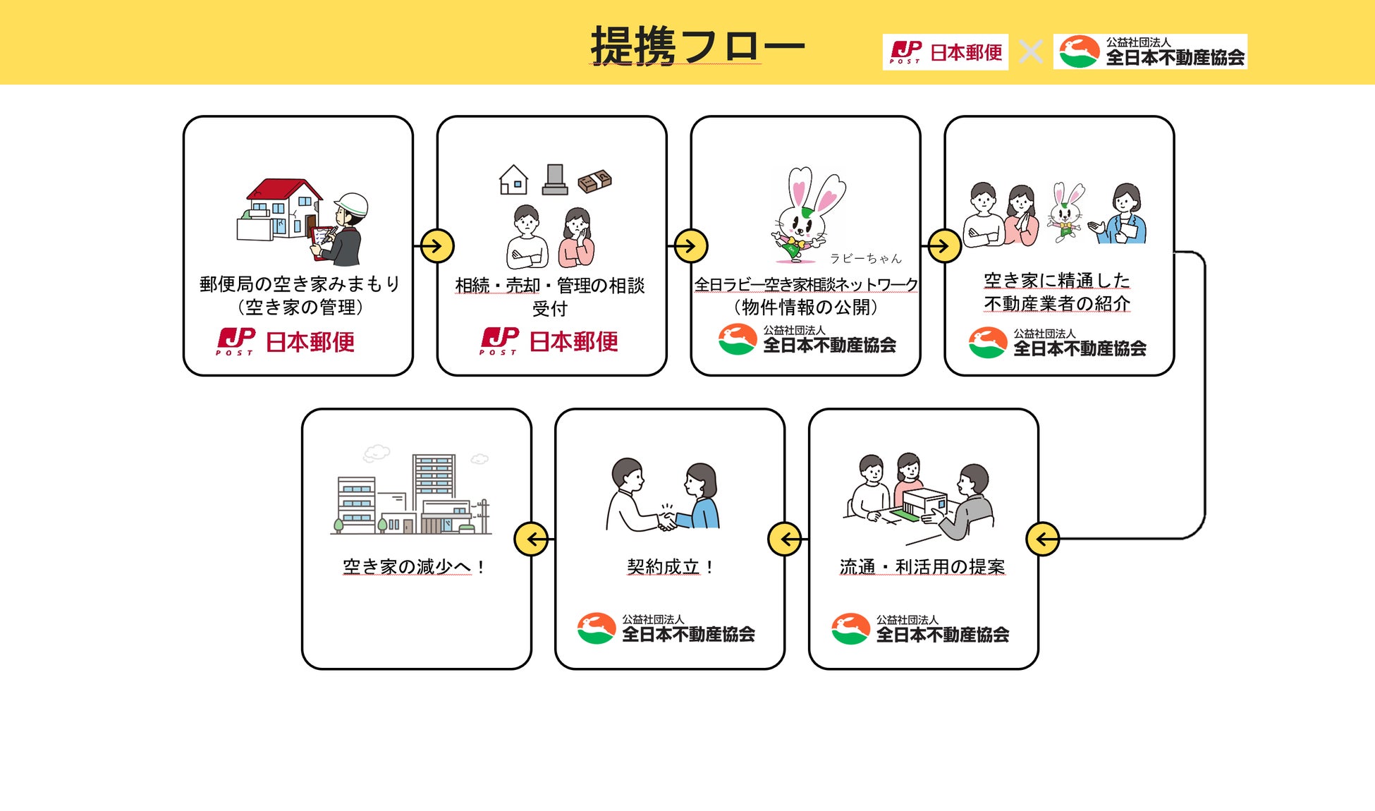 本提携により、空き家に関する日常的な巡回・確認を行う「郵便局の空き家みまもり」と、当会による空き家の流通・利活用に向けた相談窓口「全日ラビー空き家相談ネットワーク」の連携が可能となり、地域住民にとってより身近で安心できる空き家支援の体制が全国で整備されます。