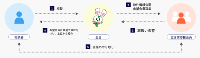 「郵便局の空き家みまもり」利用者から流通・利活用の希望があった場合、当会が空き家に精通した不動産業者「空き家応援会員」を紹介 |