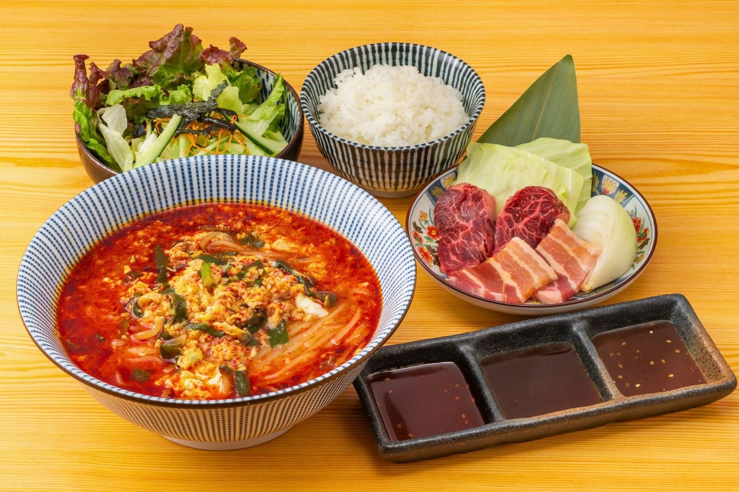 コク深い辛さがクセになる「辛麺(大)」をメインに、「ごはん(小)」、「サラダ」、さらに「お肉盛り(やみつきハラミ・もち豚カルビ)」ドリンクバーも付いた欲張りな大満喫セットです。