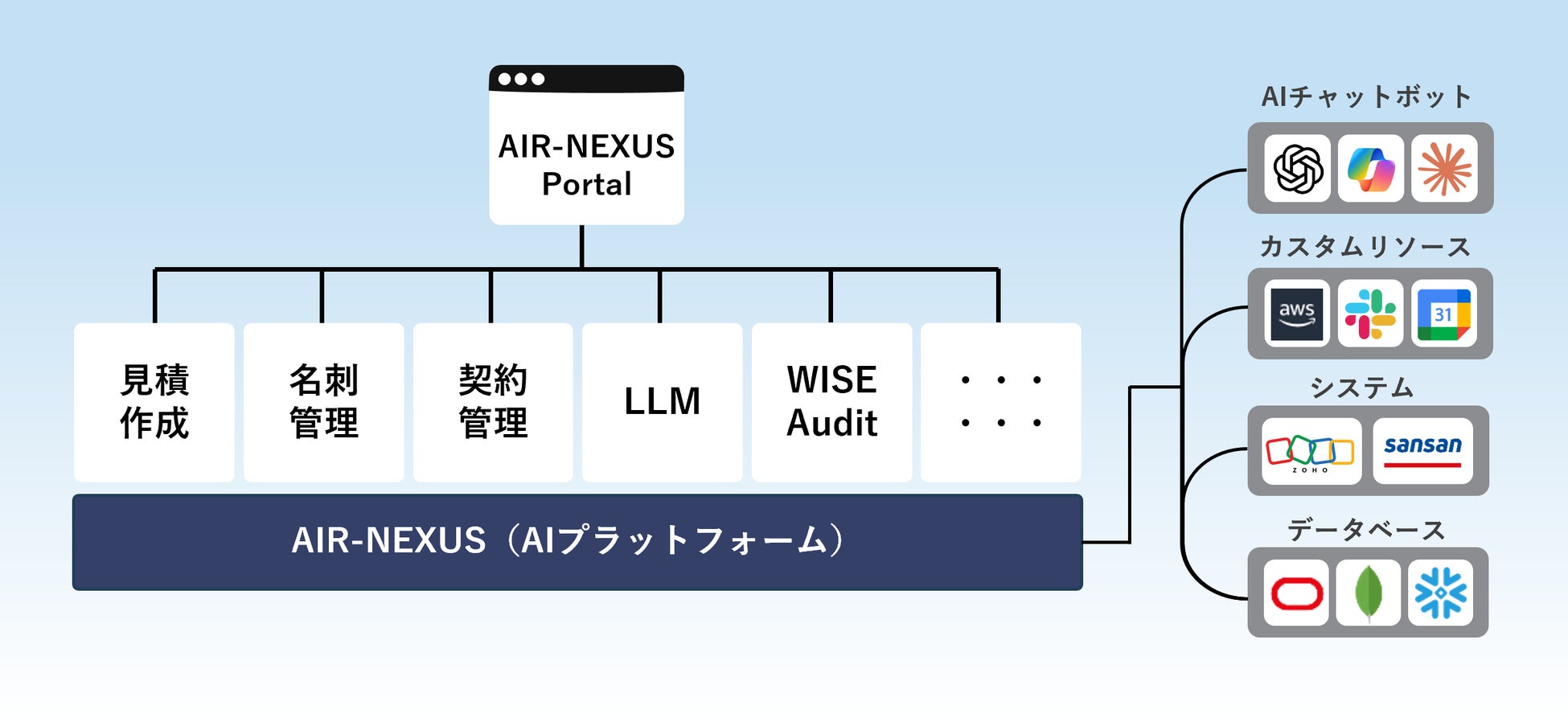 AIR‑NEXUSは、企業における生成AIの業務活用を安全かつ効率的に実現するエンタープライズAI実行プラットフォームです。AIエージェントの実行基盤、権限管理、操作ログ管理を一元化されたプラットフォーム上で提供し、信頼性の高いAI活用環境を実現します。Model Context Protocol(MCP)に対応し、オンプレミス・クラウドを問わず、さまざまな業務システムやクラウドサービスと連携が可能です。AIR‑NEXUSのポータルからプロンプトを入力するだけで、AIエージェントが安全にシステムへアクセスし、業務の実行やデータ活用を自律的に行うことができます。