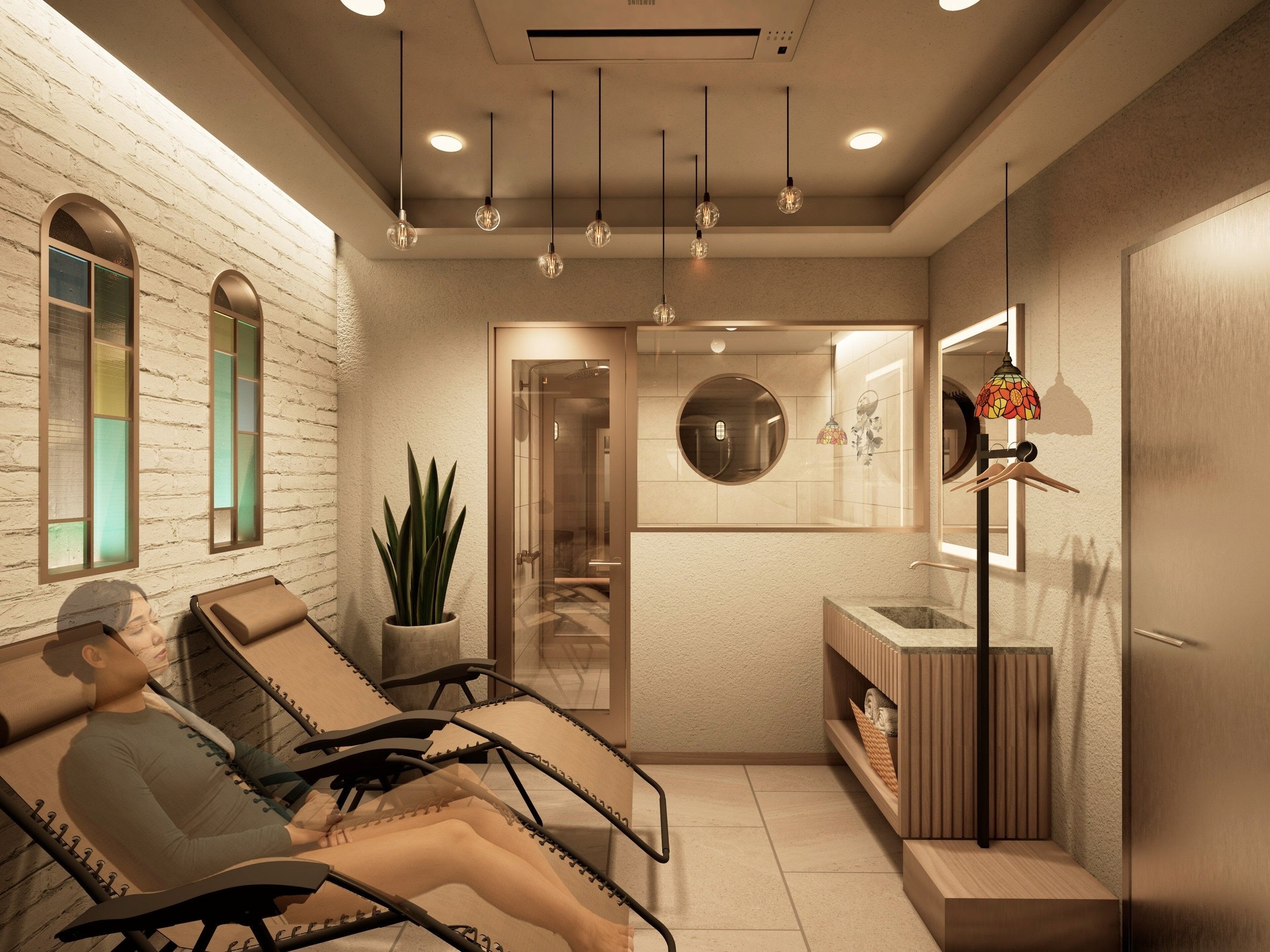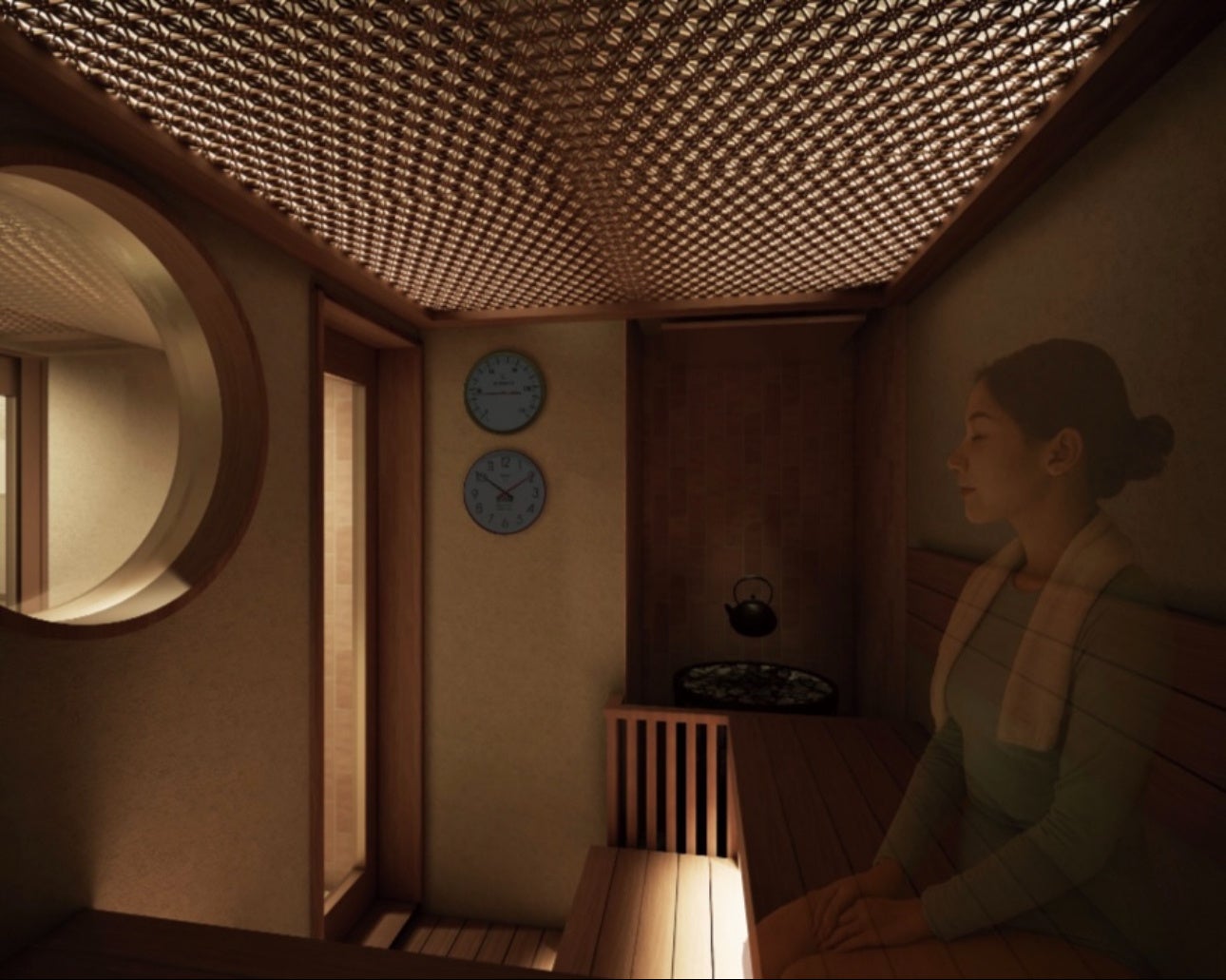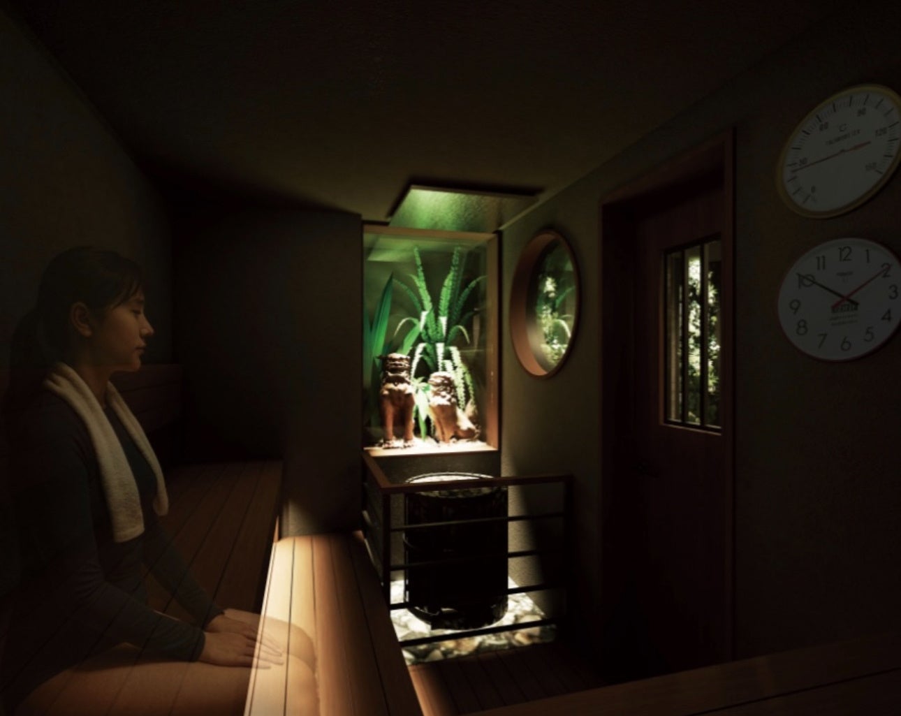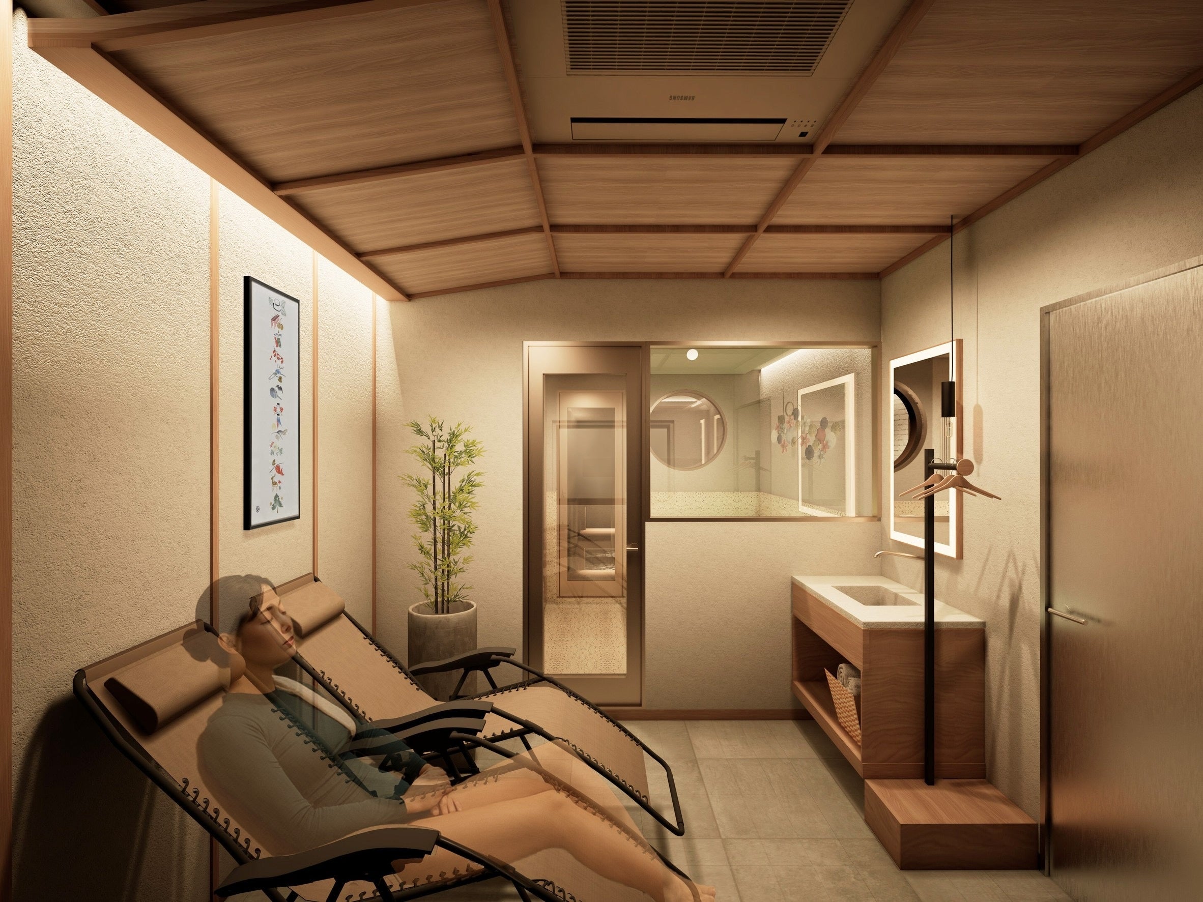 友達や恋人と「ミナミで、サ旅気分」を味わえる完全予約制の個室サウナです。京都の祇園、北海道の小樽、沖縄の石垣島をイメージした3つの個室空間を用意し、それぞれ異なる旅先の情景を感じられる設計としました。