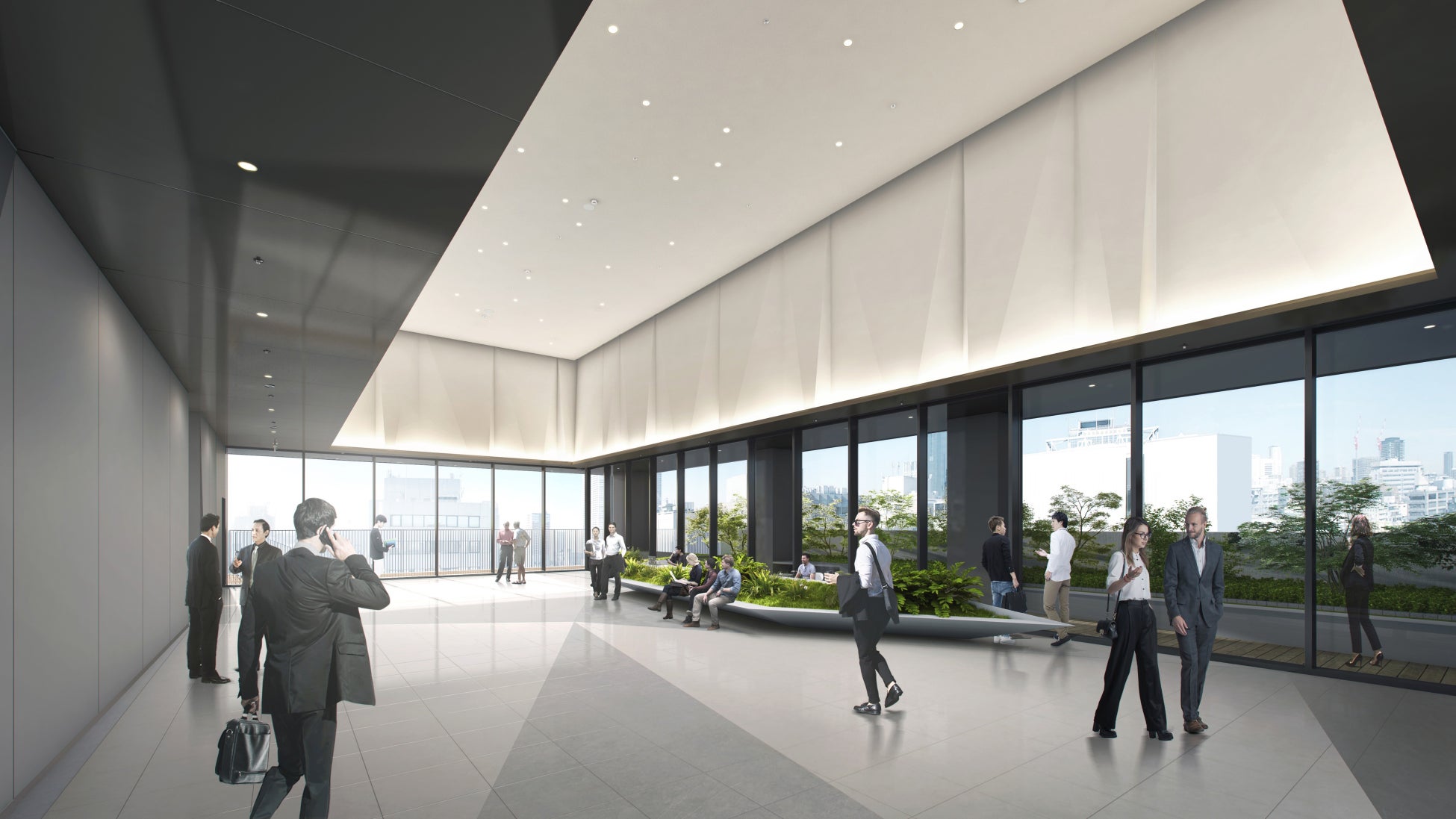 8階のオフィスロビーは2層吹き抜けの開放的な空間として計画するとともに、御堂筋を望む屋外テラスと接続し、オフィスワーカーや来街者にゆとりとくつろぎを与える空間を提供します。