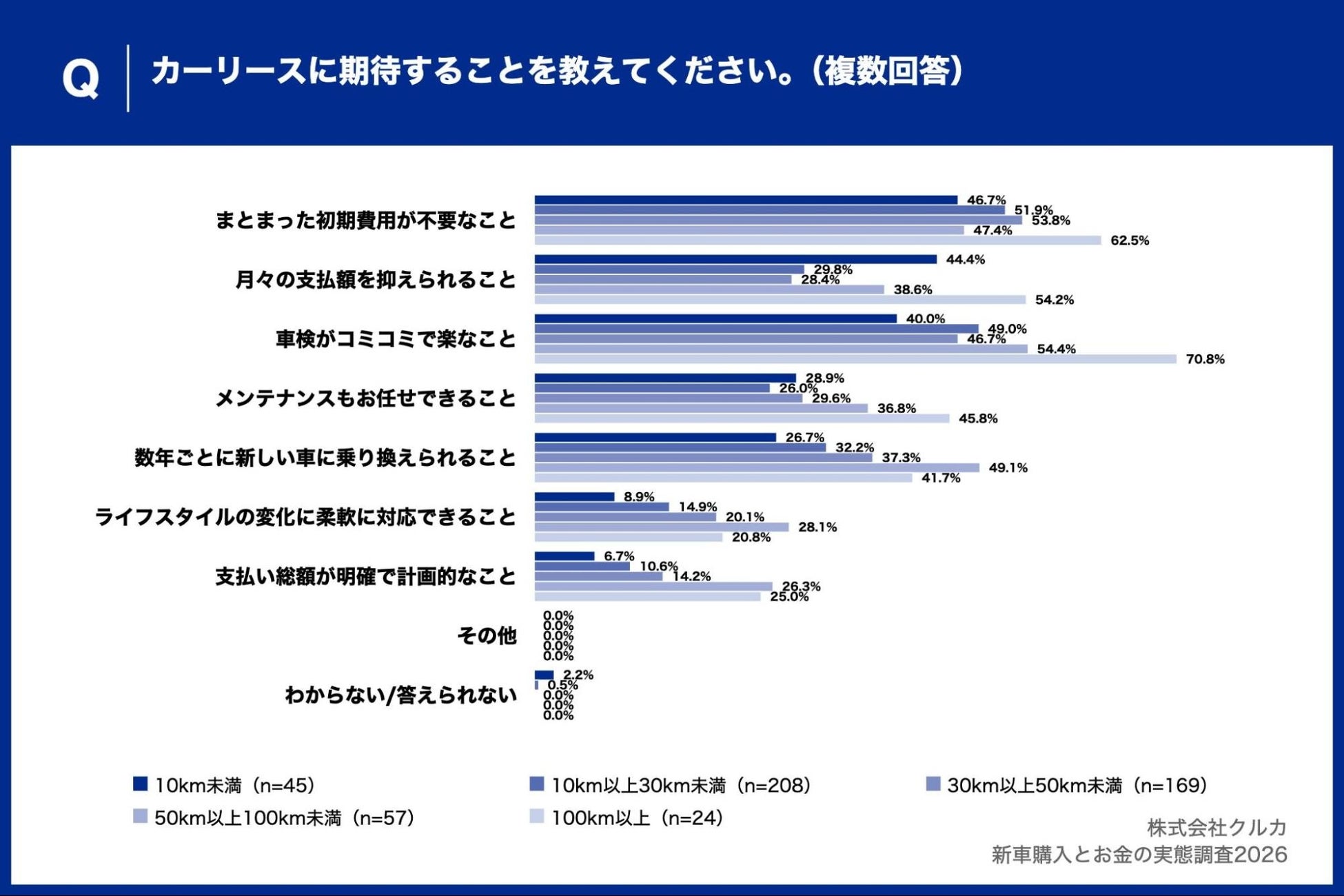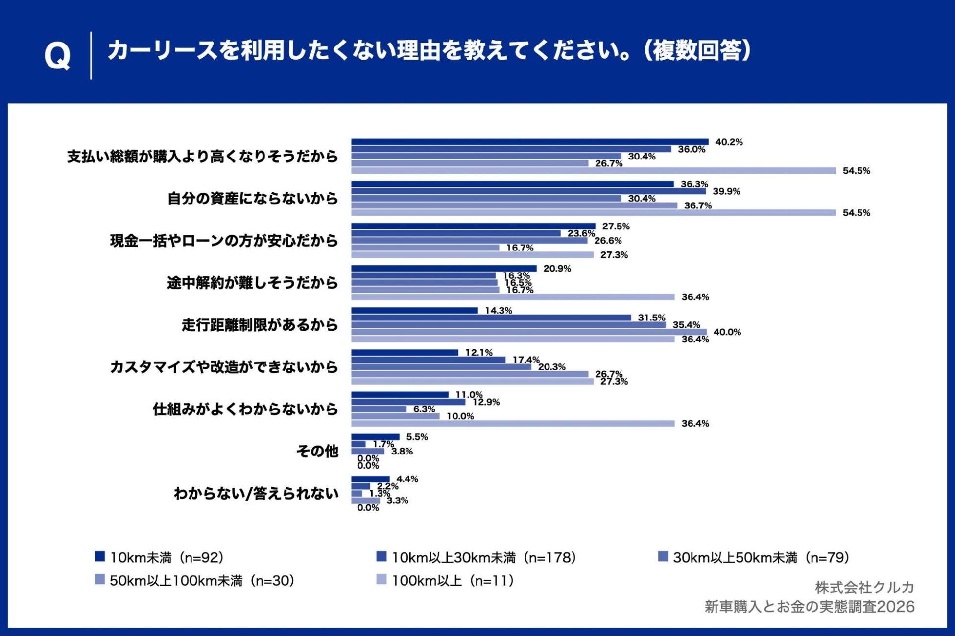 100km以上の層では「支払い総額が購入より高くなりそうだから」と「自分の資産にならないから」がともに54.5%で並び、コスト面・資産面の両面でハードルを感じている実態が明らかになりました。