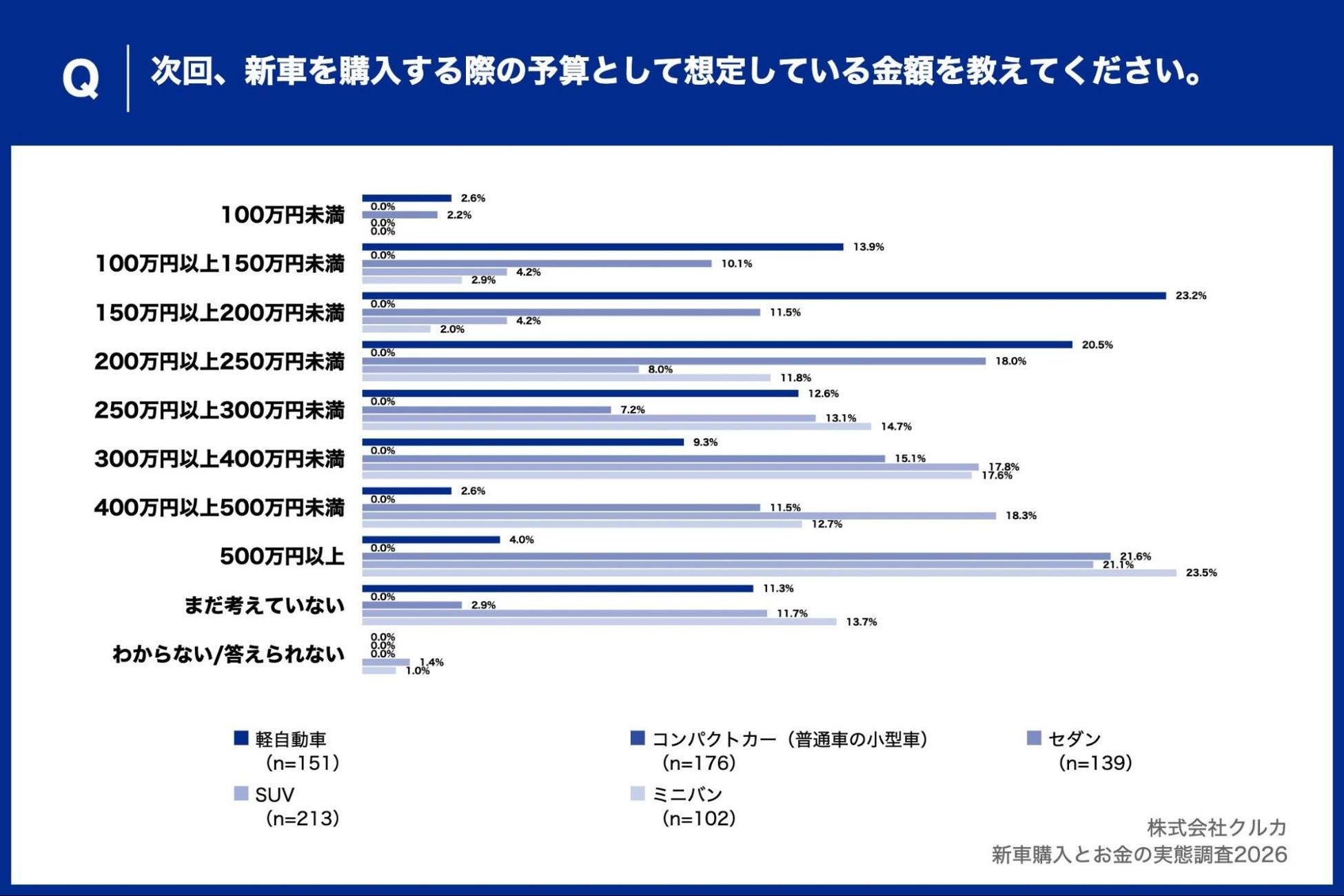 一方、軽自動車(n=151)は「150万円以上200万円未満」が23.2%で最多となり、現実的な価格帯を志向する傾向が見られます。SUV購入者は次回も高価格帯を想定しており、車カテゴリによる予算設定の違いが鮮明に表れました。