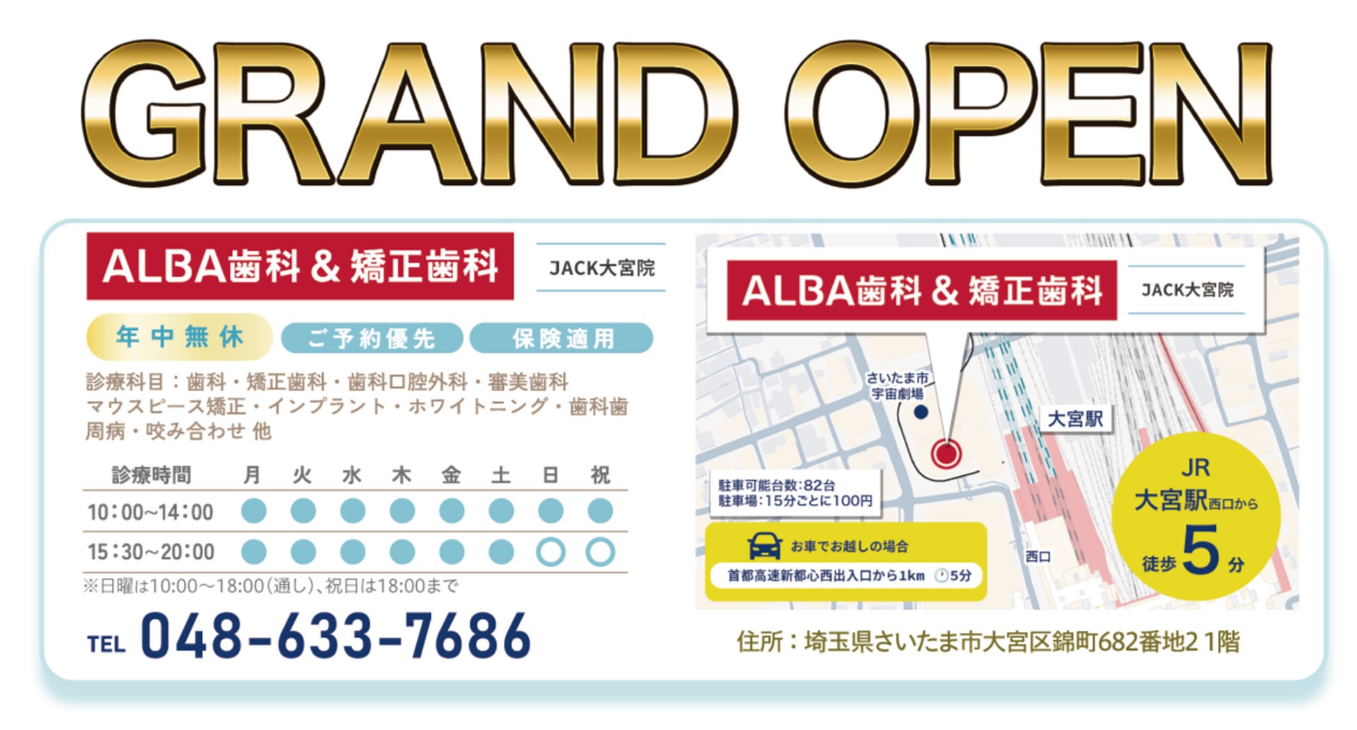 日本国内および海外で計30医院を展開し、圧倒的な症例数と最先端の歯科医療を全国に届ける医療法人社団ALBA(理事長:熊木淳雄)は、2026年5月1日(金)、埼玉県内最大の交通の要所である「大宮駅」から徒歩5分の好立地に、『ALBA歯科&矯正歯科 JACK大宮』を新規オープンいたします。