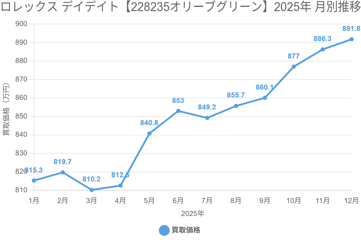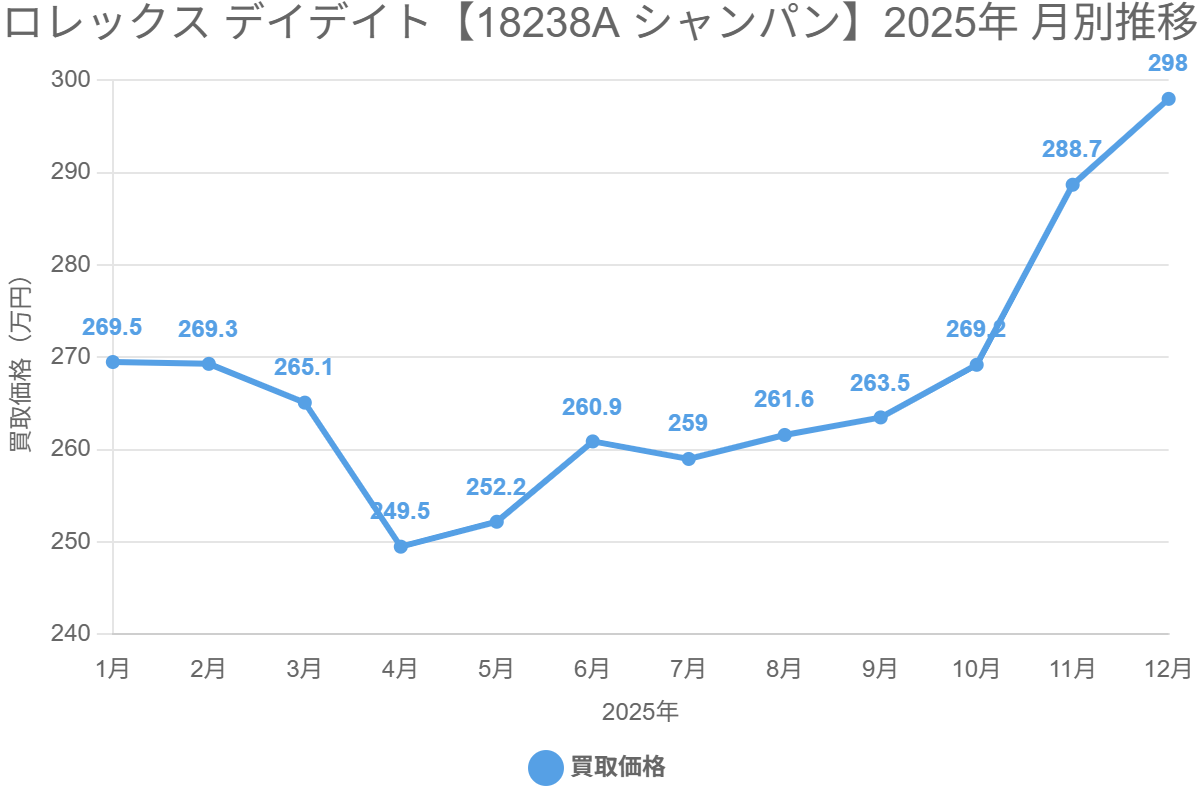 2025年のロレックス デイデイトの買取単価推移を見ると、多くの型番で前半に価格調整が見られ、後半から年末にかけて持ち直す傾向が確認されました。