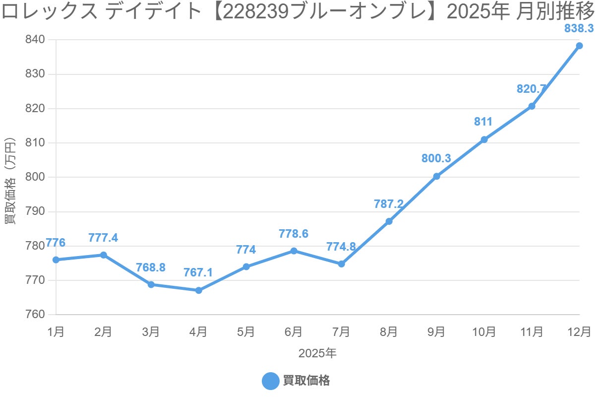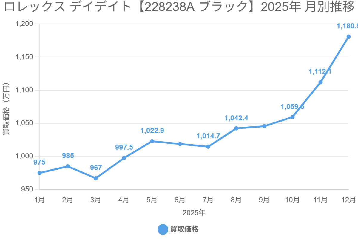 Ref.228238Aブラックは年初975万円から年末1,181万円へ、年間で約21%上昇。文字盤カラー別4モデルの月次データで見る売却の好機