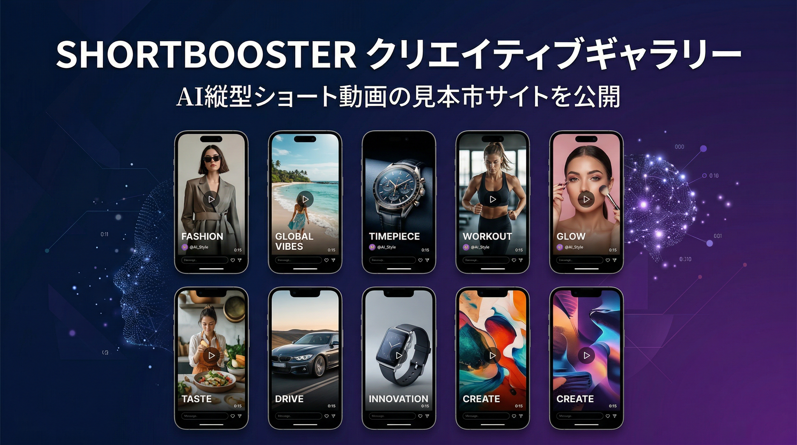 AI縦型ショート動画の「見本市」サイトを公開ーSHORTBOOSTERが生成したAI動画サンプルを業種・AIモデル別に一覧で確認できる「SHORTBOOSTERCreativeGallery」を公開