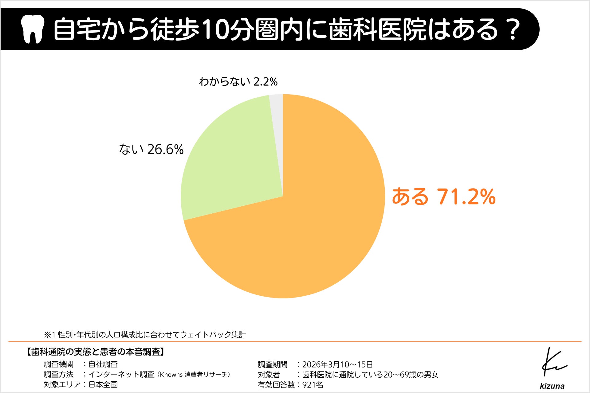 1.歯科通院者の71.2%が「徒歩10分圏内に歯科医院がある」と回答