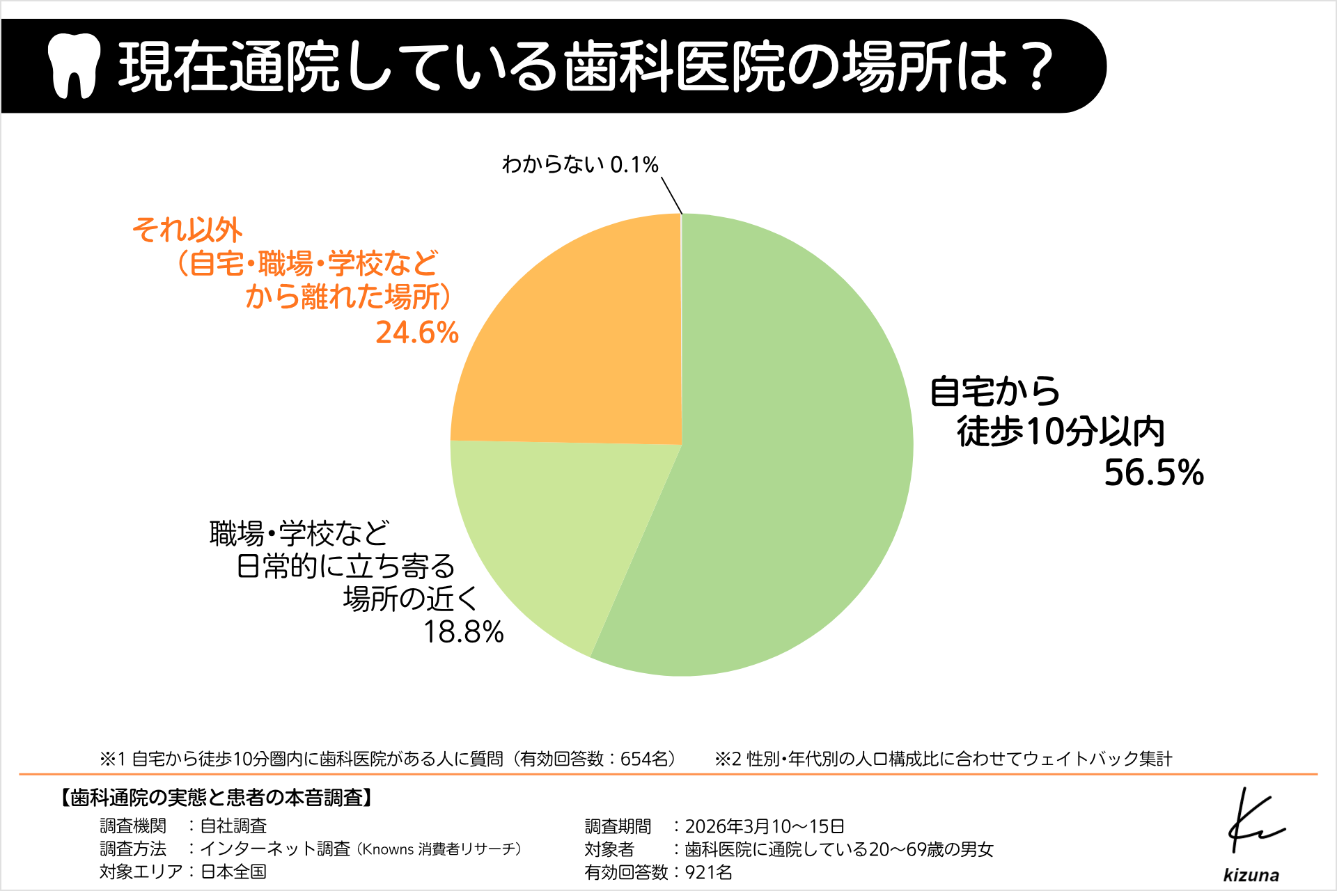 そこで、患者さまとの対話を重視し、予防歯科から審美治療まで幅広い歯科医療を提供する『医療法人きずな きずな歯科クリニック』( https://www.kizna-dc.com/ )(所在地:兵庫県神戸市北区、院長:水野貴文)は、歯科通院の実態や転院を決める背景を明らかにするため、全国の20~69歳の男女921名を対象に調査を実施しました。