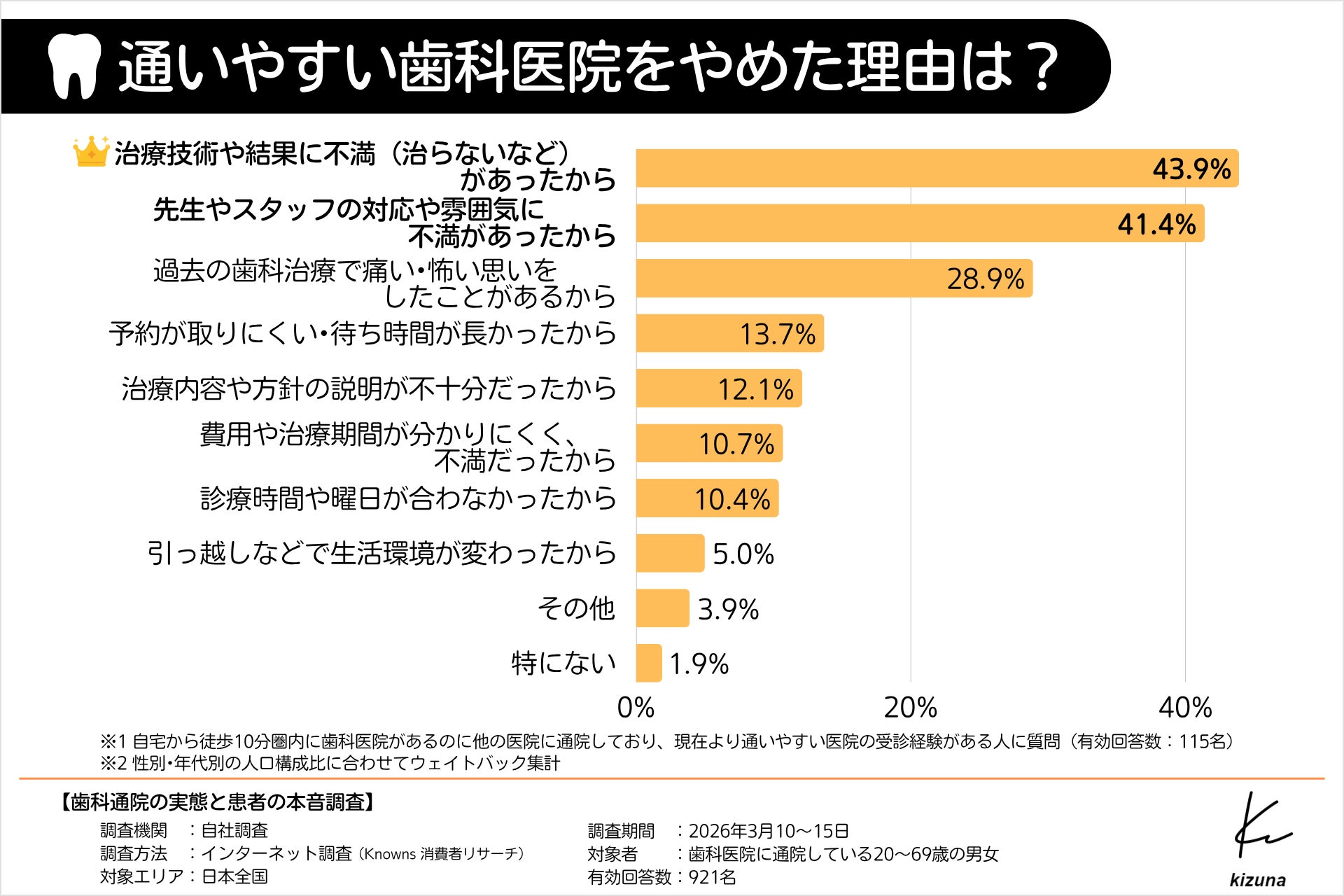 「治療技術や結果に不満があった(治らないなど)から」が43.9%で最多となりました。これに「先生やスタッフの対応や雰囲気に不満があったから」が41.4%と、わずか2.5ポイントの差で続いています。また、「過去の歯科治療で痛い・怖い思いをしたことがあるから」は28.9%となりました。