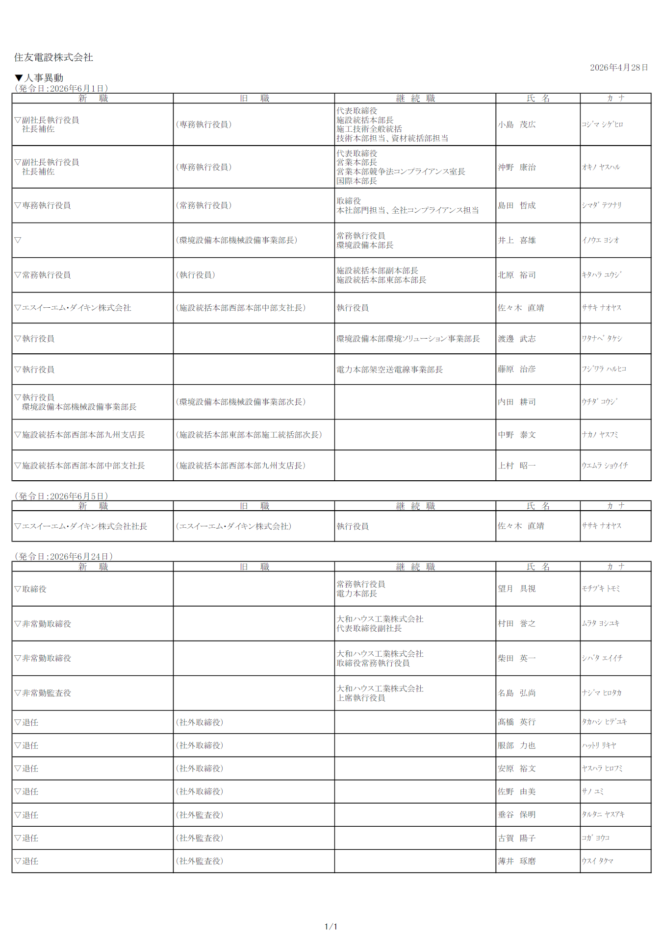 人事異動(役員異動含む)について住友電設株式会社2026年4月28日 16時52分いいね!数を読み込み中です 住友電設株式会社(本社:大阪市、代表取締役社長:谷 信)は、2026年6月1日、5日、24日付の人事異動について、下記のとおり決定いたしましたので、お知らせいたします。 こちらからもご確認いただけます。 以上すべての画像種類その他 ビジネスカテゴリ建設・土木電気・ガス・資源・エネルギーキーワード人事異動電気設備役員異動情報通信大和ハウス関連リンクhttps://www.sem.co.jp/uploads/News/553/doc1/260601%E4%BD%8F%E5%8F%8B%E9%9B%BB%E8%A8%AD_HP.pdfダウンロードプレスリリース素材このプレスリリース内で使われている画像ファイルがダウンロードできます
