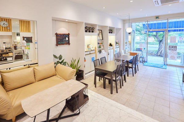 白を基調とした清潔感あふれる広々とした店内には、テーブル席とソファー席を完備。各席にはリードフックが設置されており、カフェマットやわんちゃん用のお水・食器も用意されているなど、愛犬家への細やかな気配りが行き届いています。