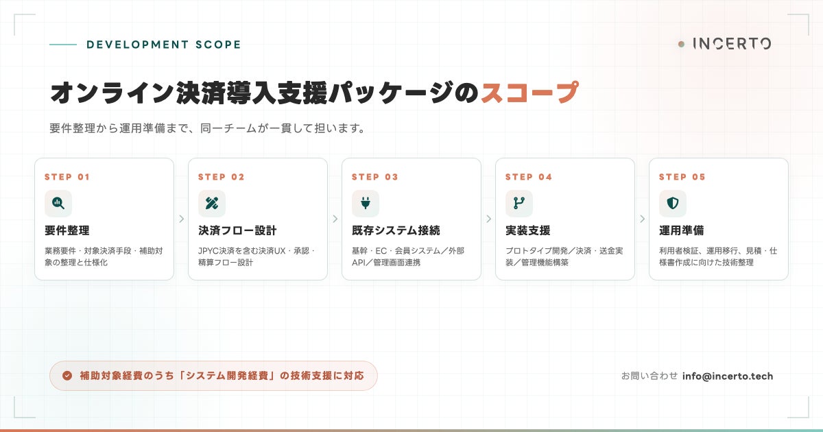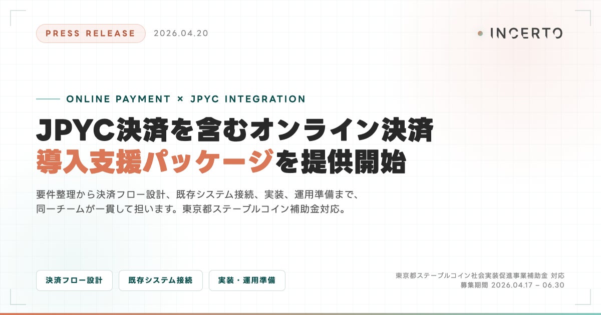 Incerto合同会社(本社:東京都荒川区、代表:佐藤碧人、https://www.incerto.tech/)は、日本円建てステーブルコインを含むオンライン決済の導入支援を行う「オンライン決済導入支援パッケージ」の提供を開始しました。要件整理から決済フロー設計、既存システムとの接続方針の策定、実装支援、運用準備まで、同一チームが一貫して担います。