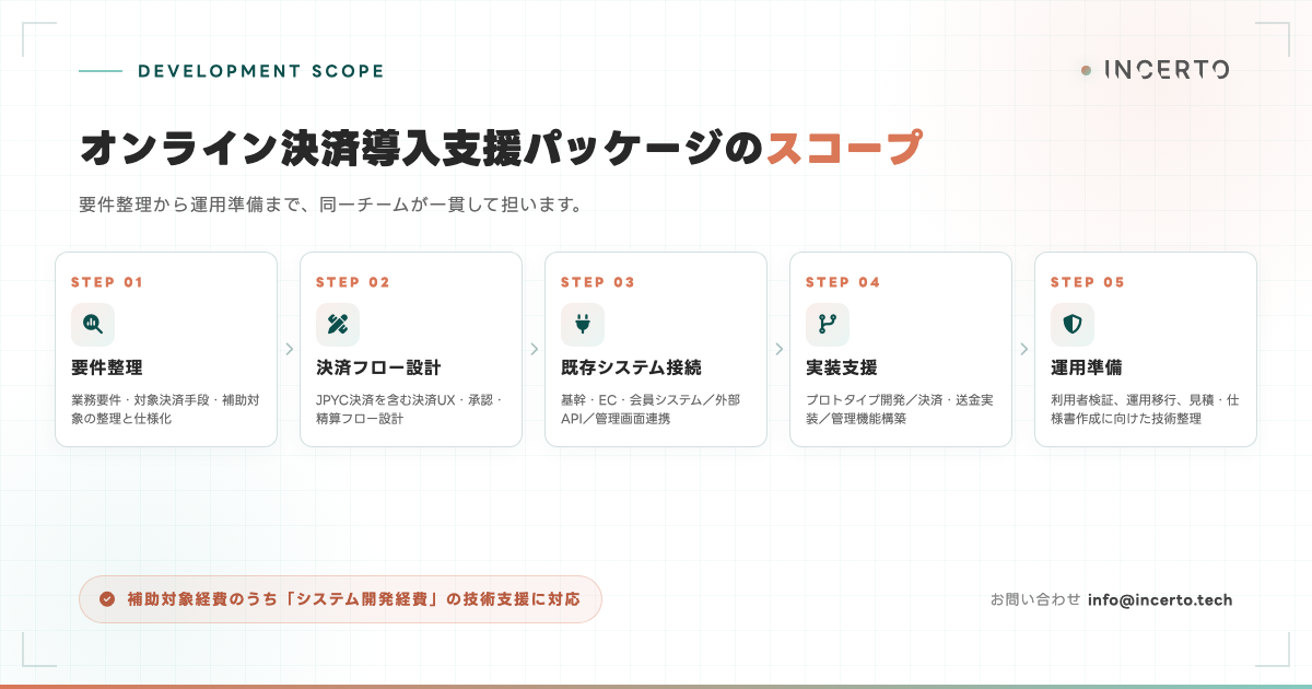 Incertoは、2016年から暗号資産・ブロックチェーン領域で積み重ねてきた実装経験を土台に、事業者ごとの事情に合わせた決済導入を支援します。補助金を活用する場合も、そうでない場合も、まず事業に合った決済の形を一緒に整理するところから検討を始めることができます。