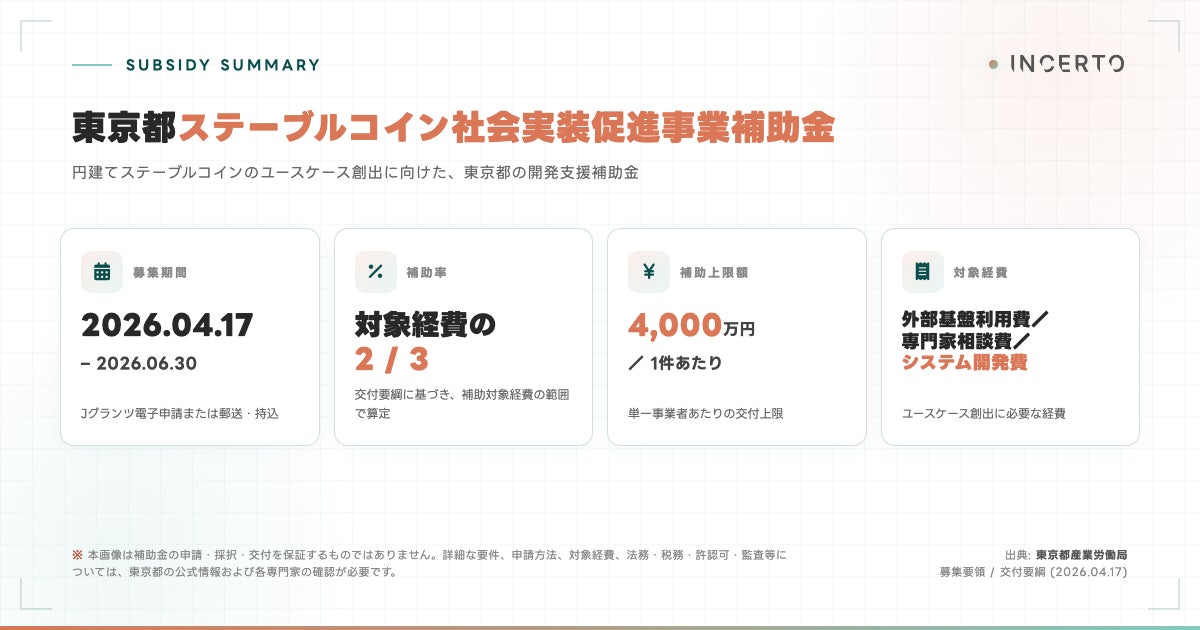 東京都は2026年4月17日、ステーブルコイン社会実装促進事業補助金(補助率3分の2、1件あたり上限4,000万円、募集期間2026年6月30日まで)の公募を開始しました。制度・発行体・政策の条件が揃いつつある今、事業に合った決済体験をどう組み込むかが、企業の実務課題になっています。Incertoはこの局面に向けたパッケージを提供し、初回は無料ヒアリングを実施します。