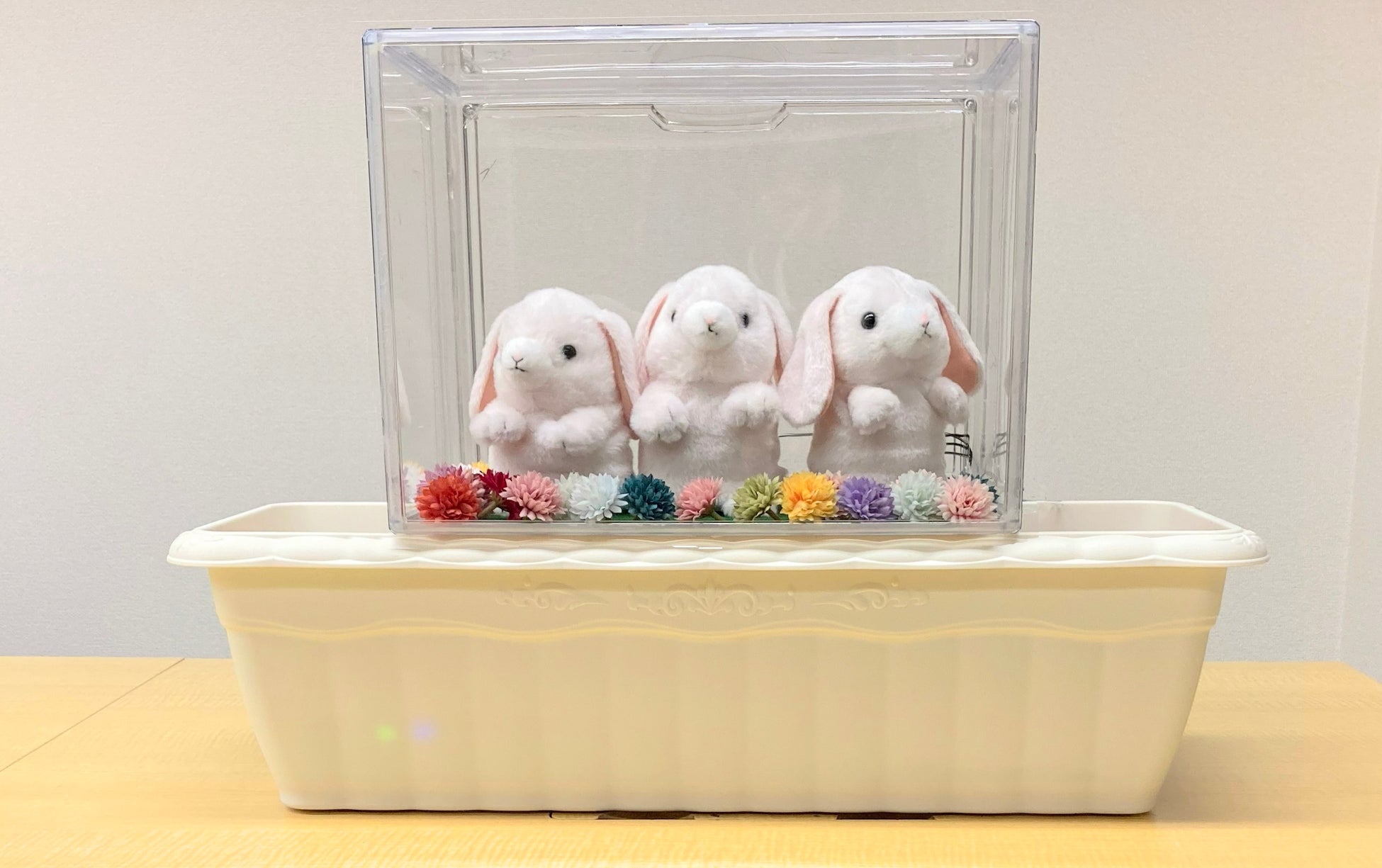本展示は、同園の「富士山ベンチ」を舞台に、イースターにちなんだウサギ型の人形を配置。本来の乾電池駆動から、ベイサンが独自にカスタマイズしたペロブスカイト太陽電池と