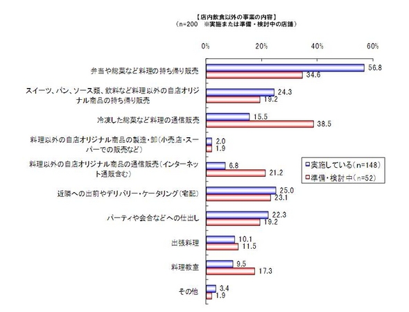店内飲食以外の事業内容を、「実施している」または「準備・検討中」の店舗に聞いたところ、