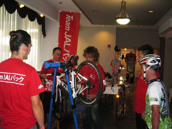愛車のメンテナンスは、「Team JALパック」メカニック隊にお任せください。白戸さんおすすめのサイクルショップからプロの日本人メカニックが参加し、現地でのメンテナンスを行います。