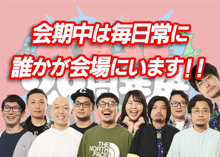 会期中は土日を含む全日、オモコロのメンバーの誰かが日替わりで会場スタッフとして勤務(時間帯非公開/個別の写真・サイン・握手等は不可/混雑時は中止の可能性あり)。