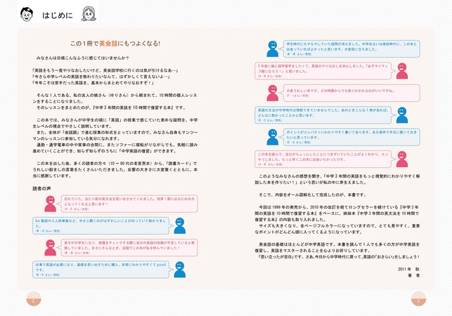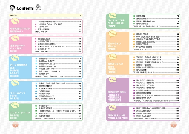 130ページ弱の手軽な体裁ながら、オールカラーの図解・イラストがたっぷりなので、中学3年間の英語がぎゅっと凝縮されています。