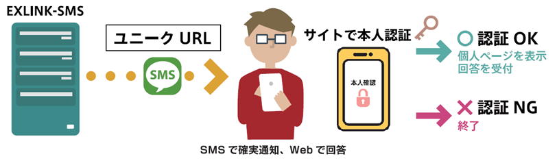 SMSを受信した対象者がサイトにアクセスする際、会員番号・誕生日・パスワード、その他の個人のみが知り得る属性情報を確認/入力することにより、複雑なユーザ操作が一切不用で「なりすまし」を防止し、安価且つ確実に本人確認を行い、回答受付ができるシステムです。