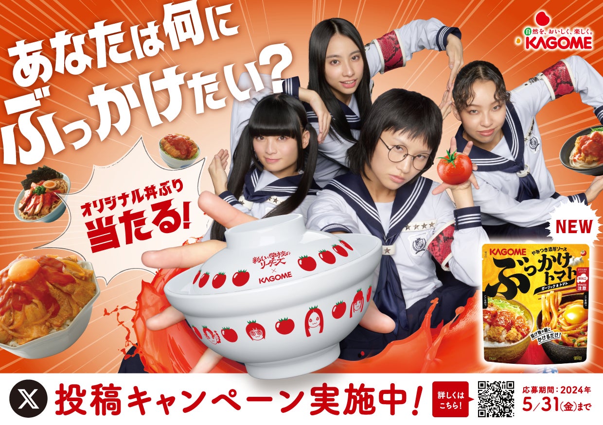 カゴメ株式会社(本社:愛知県名古屋市中区、代表取締役社長:山口聡)は、新商品「ぶっかけトマト ガーリック&トマト」および「カゴメトマトケチャップ」の広告キャラクターとして、2024年2月27日より、ダンスボーカルユニットの新しい学校のリーダーズを起用し、はみ出した新しいトマト調味料の使い方を提案し、発信しています。新しい学校のリーダーズ×カゴメのコラボWEB動画の第一弾は、670万インプレッション(※)を記録し、大きな反響をいただきました。第二弾となる今回は、新しい学校のリーダーズが様々な料理に「ぶっかけトマト ガーリック&トマト」をぶっかけていくリズムゲーム風WEB動画を2024年5月1日(水)より公開いたします。さらに、同日より抽選でオリジナル丼ぶりが当たるX投稿キャンペーンの第二弾も開始いたします。