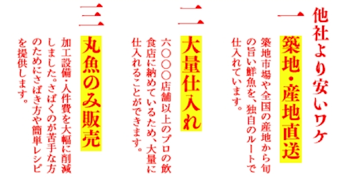 築地市場や全国の産地から旬の新鮮で美味しい鮮魚を独自のルートで仕入れていることや、大量に仕入れること、調理加工の必要がないことなどから、お客様に新鮮で旬な魚を他の店舗よりも低価格で販売することが可能となります。また、オープン記念キャンペーンとして、2月16日(木)〜23日(木)の間、対象魚種に限り一尾50円で販売します。