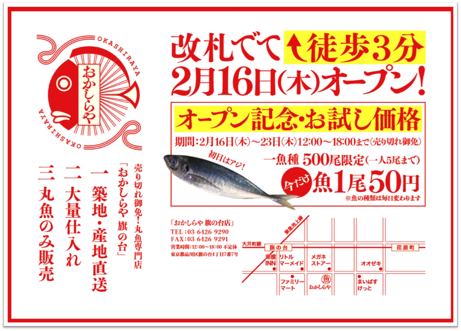 お店に包丁なし・加工なし・だから激安!の鮮魚店が誕生 フーディソンの新業態一号店、丸魚専門店 「おかしらや 旗の台」 オープン 〜 2月16日のオープンから8日間一尾【50円】で特価販売 〜