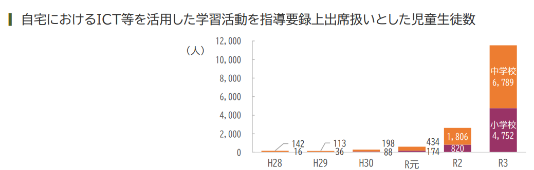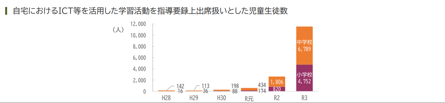 上記調査内「自宅におけるICT等を活用した学習活動を指導要録上出席扱いとした児童生徒数」は、令和元年と令和3年を比較すると小学生:27倍、中学生:16倍と急増しており、不登校児に対しての学習支援環境は大きく変化してきています。※画像は上記調査より