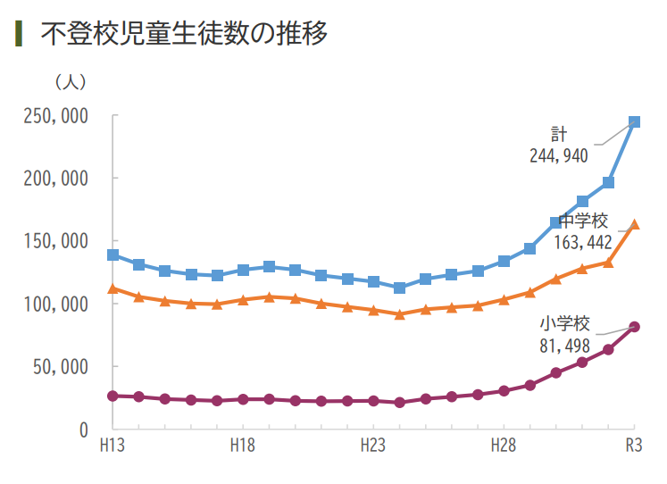 文部科学省の調査「令和3年度 児童生徒の問題行動・不登校等生徒指導上の諸課題に関する調査結果の概要」によれば、不登校児童生徒数は平成24年から9年連続で増加し過去最高を更新しました。※画像は上記調査より