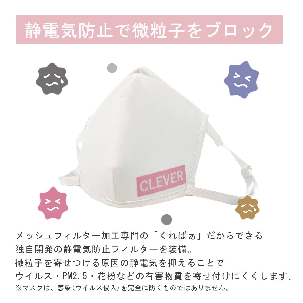 メッシュフィルター加工専門の「くればぁ」だからできる独自の静電気防止フィルターを装備。 微粒子をマスクに寄せつけることなく防ぐことができます。
