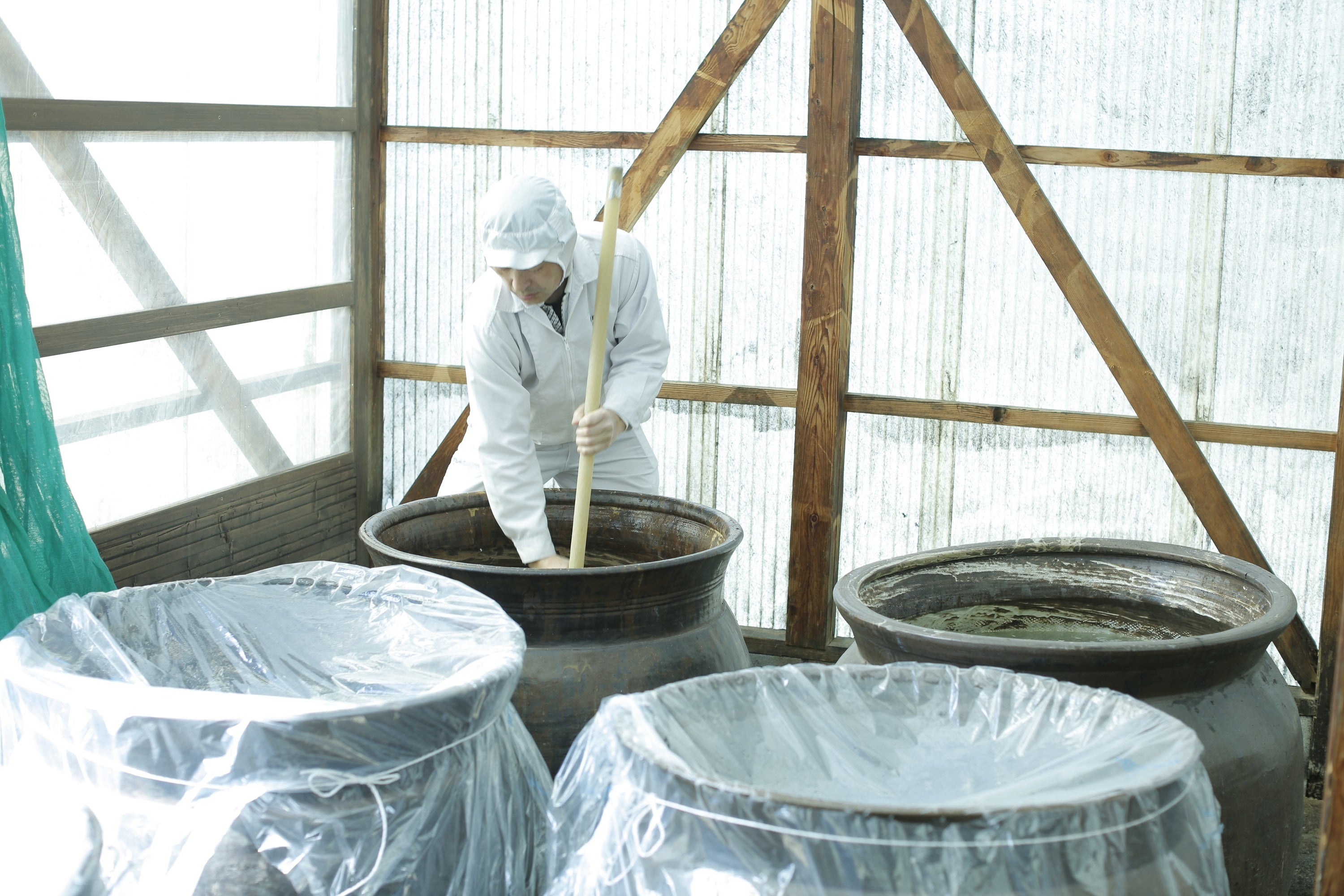 庄分酢のくろ酢の原料は米、水、麹の3つと、いたってシンプル。熊本県の契約農家の有機栽培玄米を使い、年に2回、春と秋のお彼岸の時季に仕込みます。仕込み甕の中で、良質の麹菌が米を糖化させ、酵母菌の作用で酒となり、そして表面に張った酢酸菌の働きで酢に変化していきます。微生物によって静かに発酵が進んでいく、まさに神秘的な過程です。職人たちは、仕込み甕の紙蓋を開けて、菌膜の状態を見極めて手入れをします。菌膜の状態は甕ごとに異なり、まるで我が子を育てるかのように心を込めて、酢酸菌が十分に活躍できる環境を日々整えています。