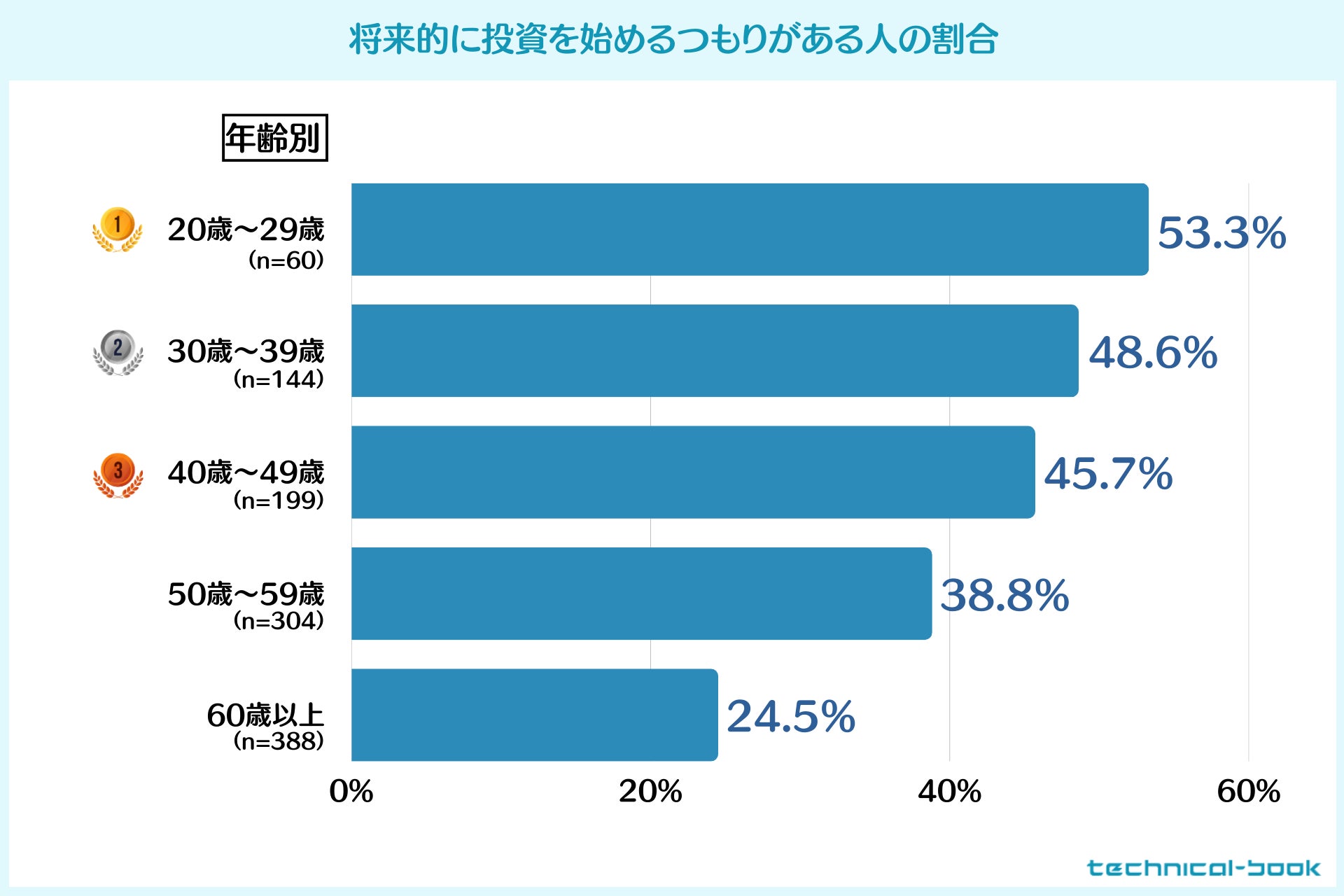 将来的に投資する意思がある人の割合を年齢別に集計してみると、最も高い割合となったのは20歳~29歳の53.3%でした。年齢上昇とともにこの割合は低下しており、2位は30歳~39歳の48.6%、3位は40歳~49歳の45.7%、4位は50~59歳の38.8%、最も低かったのは60歳以上の24.5%となっています。