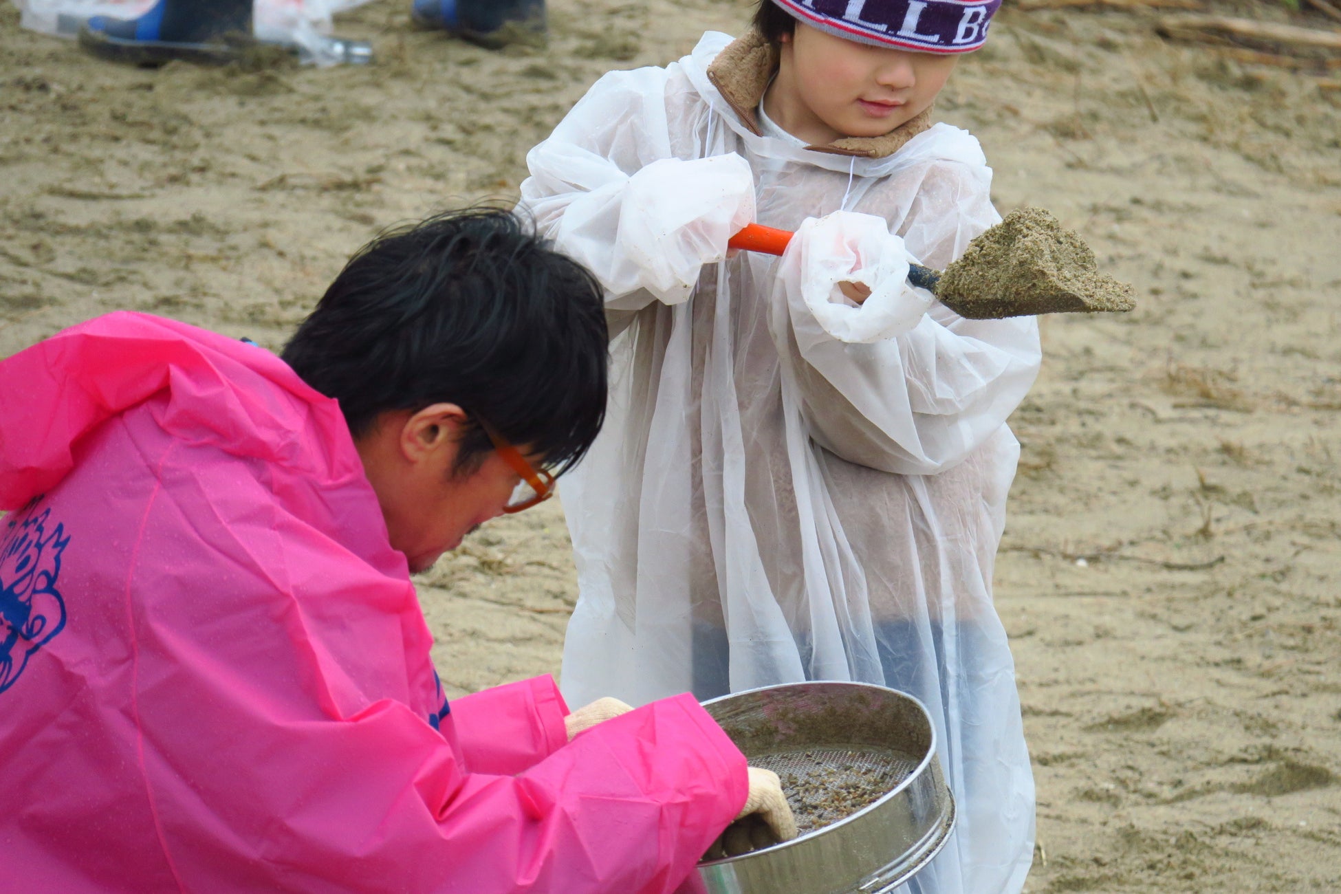 当日は、朝から冷たい雨の降る天候の中、約200人が会場に集まってくれました。小さいお子さんを含む家族連れ、アルピニスト野口健さんやFM大阪のDJのファンだけでなく、「堺に海岸があることを初めて知ったが、このイベントを機に、堺浜をキレイにしたい!」という方、「毎日散歩でこの浜付近を通るが、ゴミが気になっていた。ラジオ番組での告知を聴いて応募した。」「子どもに、環境のことを考えてもらうきっかけとして参加した。」などなど、様々な思いをもったリスナーが集いました。「堺浜をきれいにするぞー!」の掛け声とともに、時折、冷たい雨と風にさらされながらも、約60分間の清掃活動にご協力いただきました。参加者は3班に分かれて清掃活動。砂浜の清掃担当の班は、海に流れ着いて砂浜に打ち上げられたゴミを拾ったり、海の砂ごとふるいにかけ、プラスチックゴミが自然環境中で破砕・細分化されたものを砂から取り出すという、細かい作業をしてくれていました。浜辺では、季節外れの花火の燃えカス、ライターなども見受けられました。