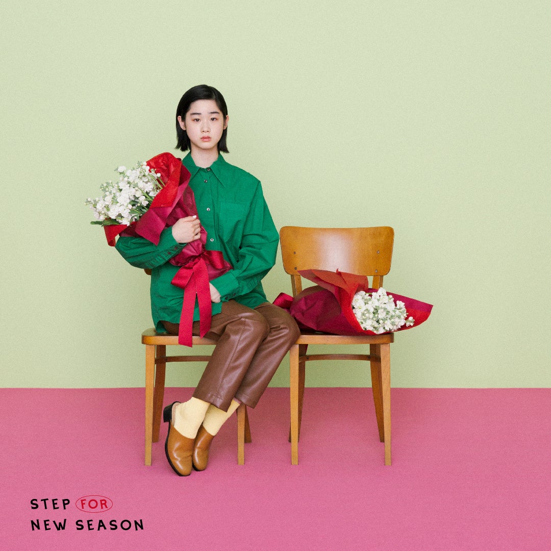 今シーズンは椅子に座って踊るラインダンスから着想したビジュアルです。踊るような気持ちで新しい季節を迎えられたらなという気持ちを込めて。外出して動き回ることが少ない日々が続いていますが、座ったままでも楽しいことはいっぱいあります。横に目をスライドさせて見てゆき、次はどんなシチュエーションでどんな靴を履いているのか、とワクワクしてもらえれば嬉しいです。
